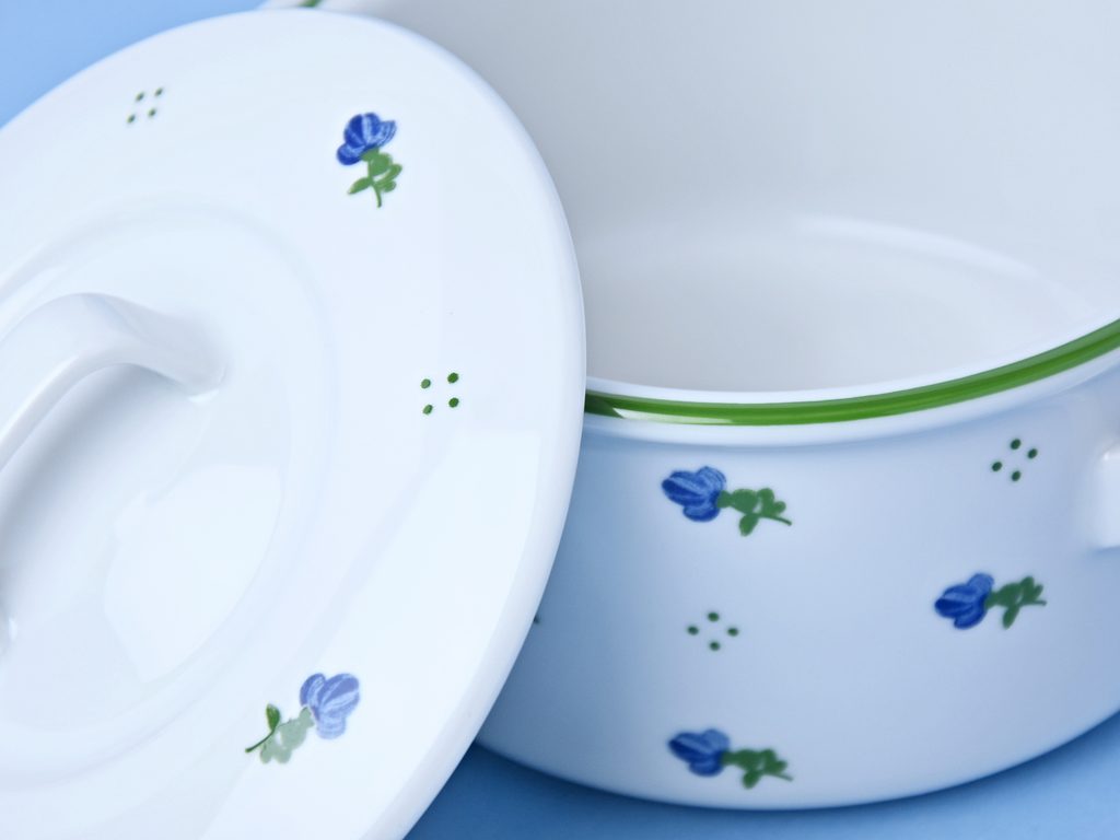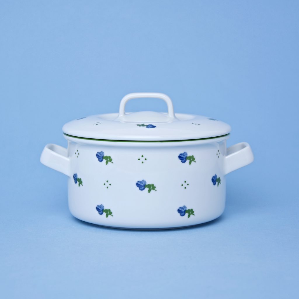 Krásný  retro šálek / kotlík na polévku s pokličkou a dekorem modrých kytiček. Dá se koupit do kompletu i dezertní talířek 19 cm, který rozměrem pod kotlík krásně pasuje. Rendlíček se dá perfektně využít nejen na servírování, ale i na uskladnění potravin, či zbylé porce jídla do ledničky nebo na zapékání a pečení.