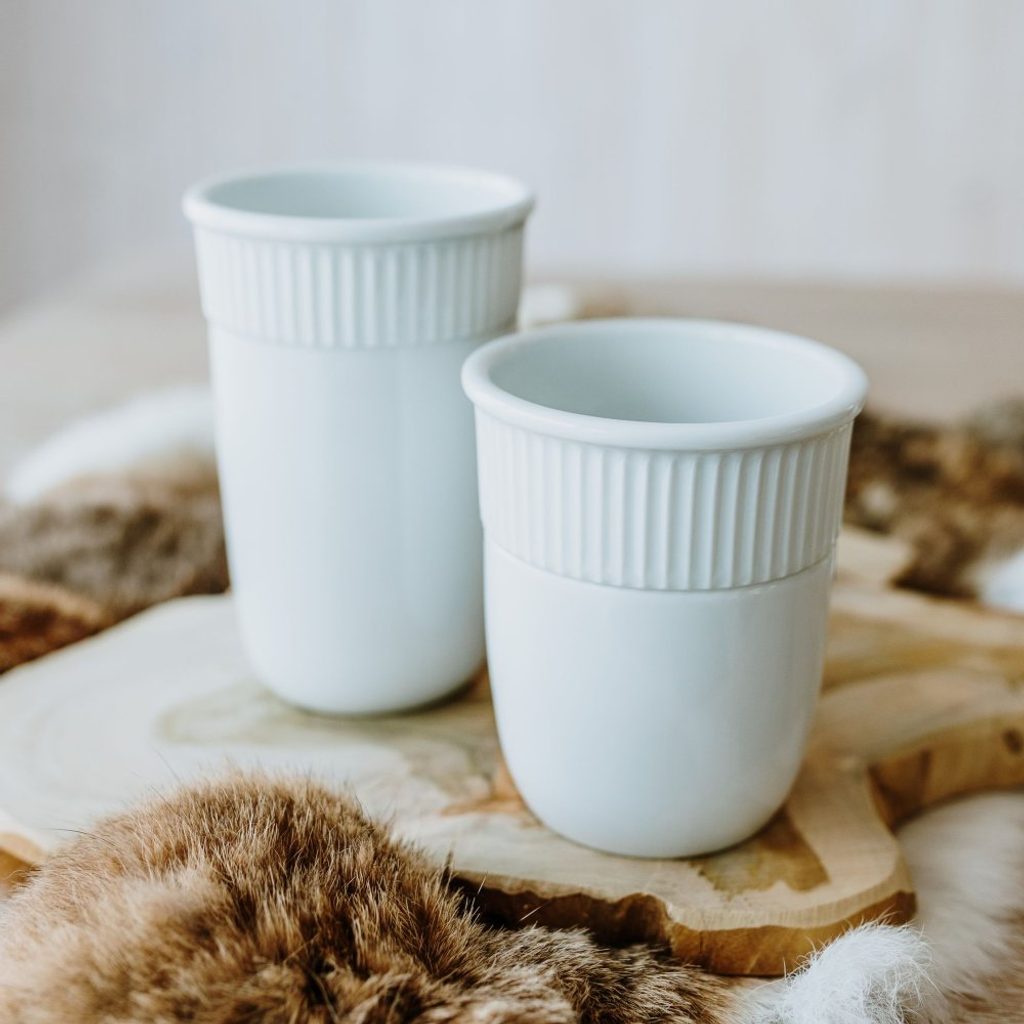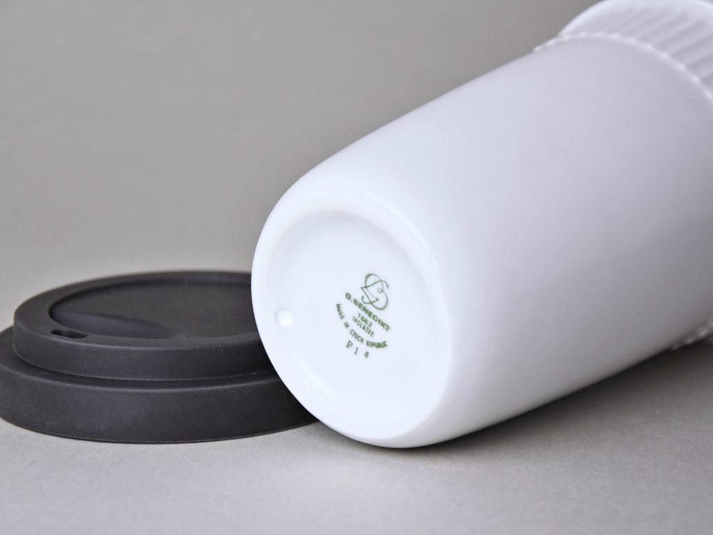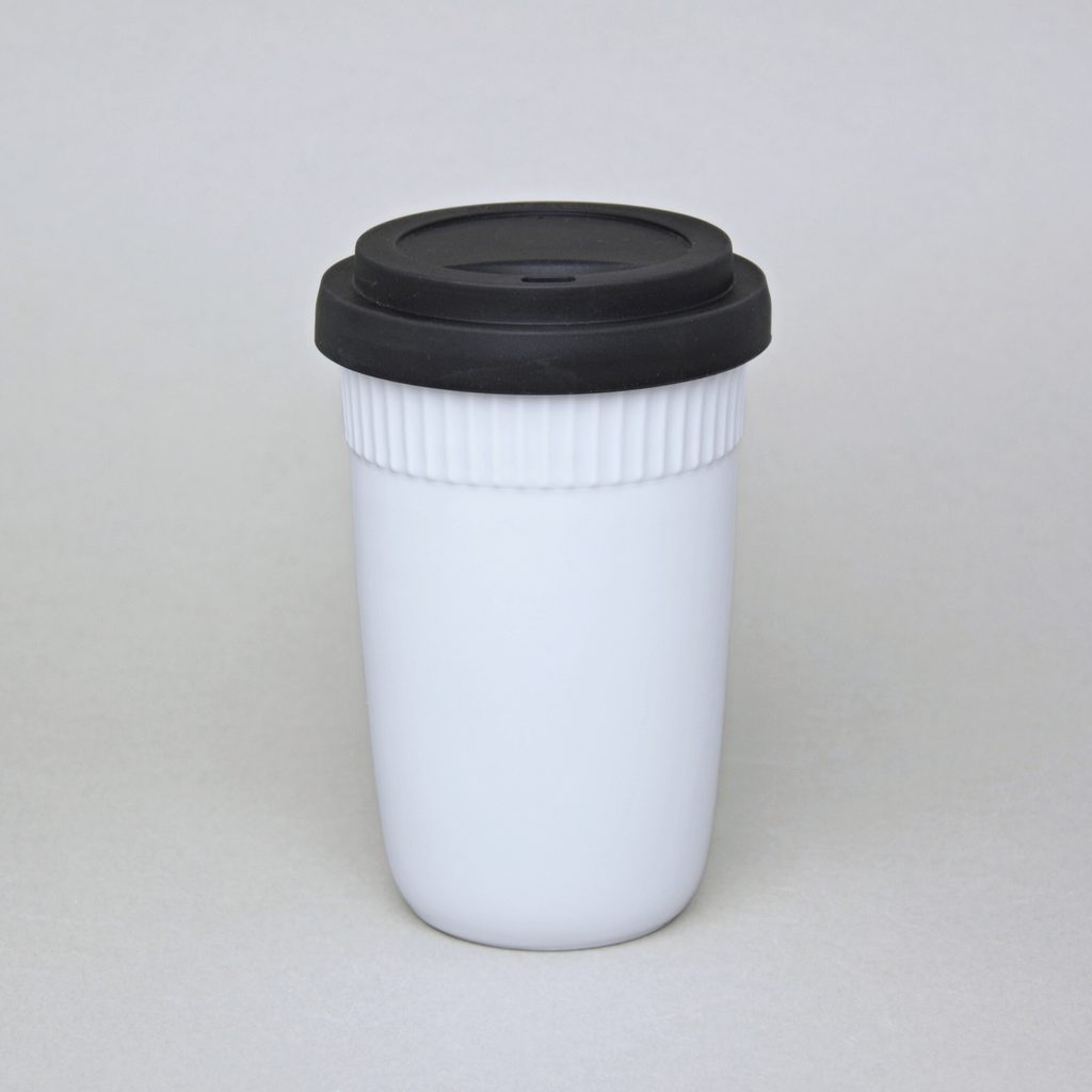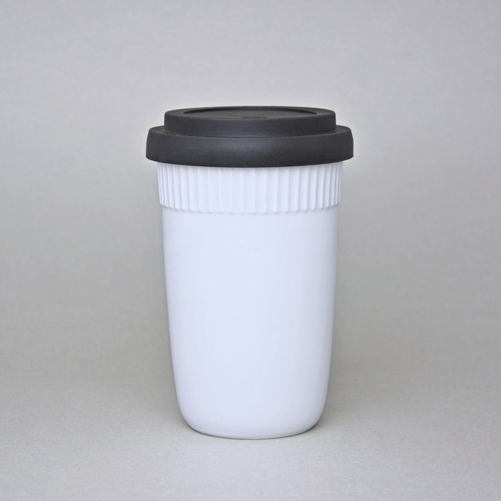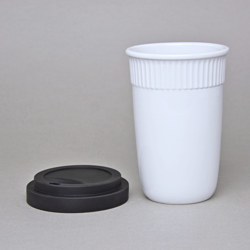 šálek s dvěma stěnami, na horký (např. káva, čaj), který si díky speciální konstrukci šálku uchová teplotu a zároveň si nepopálíte prsty - na kávu sebou, s černým gumovým víčkem