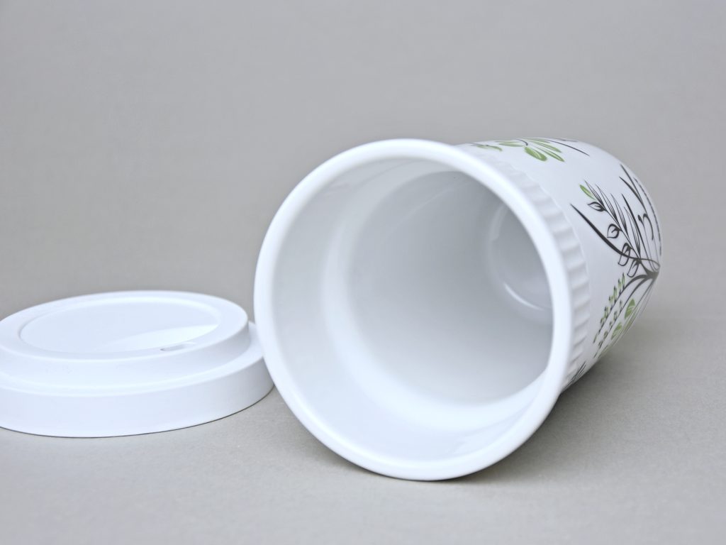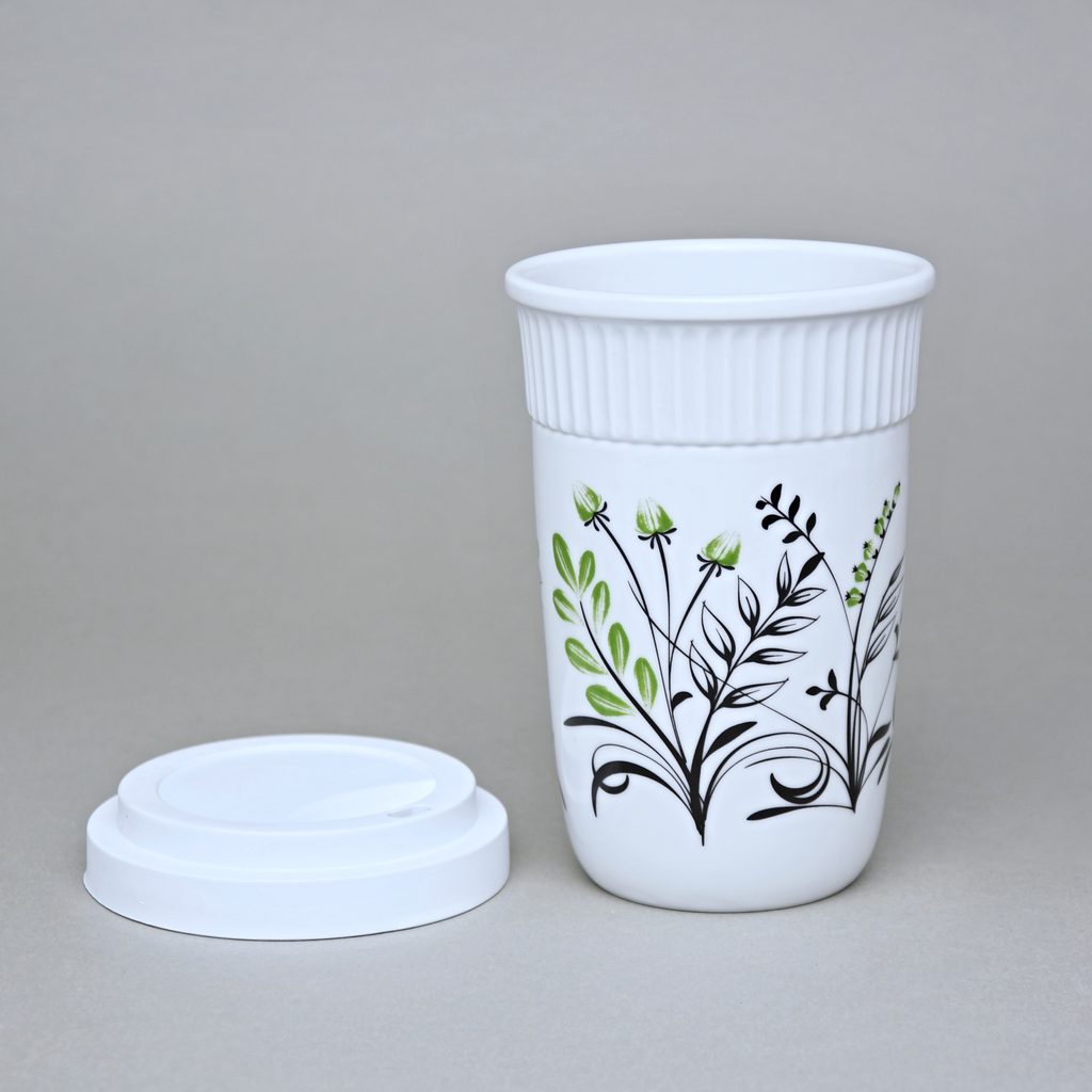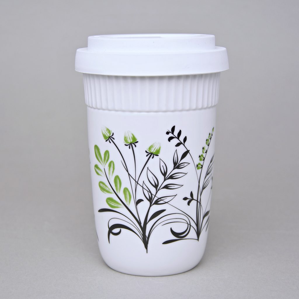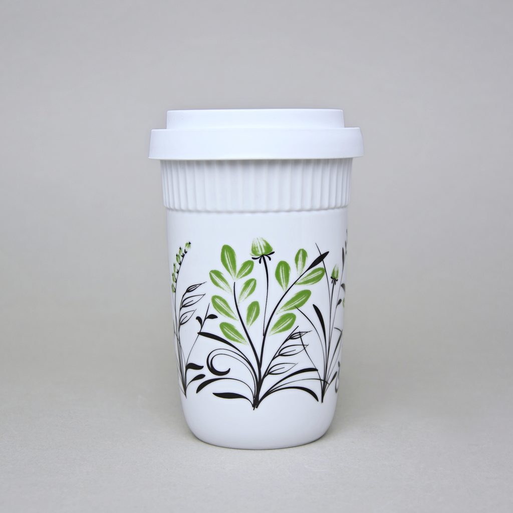 šálek s dvěma stěnami, na horký (např. káva, čaj), který si díky speciální konstrukci šálku uchová teplotu a zároveň si nepopálíte prsty - na kávu sebou, s bílým gumovým víčkem a jednoduchým květinovým dekorem