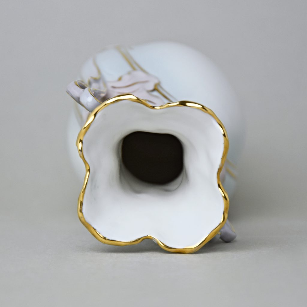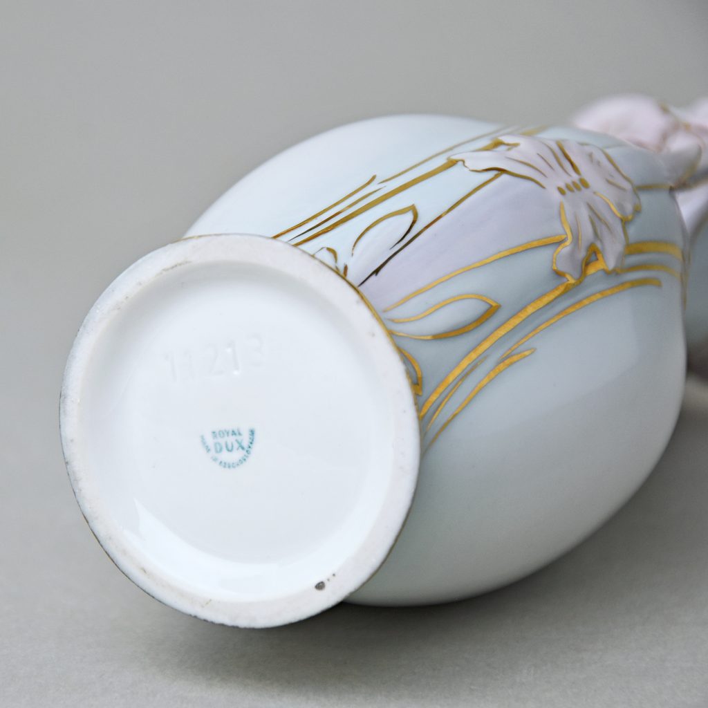Luxusní secesní vázička z tradičního českého porcelánu z dílny Duchcov (Royal Dux Bohemia). Světle modrá barva, růžové květy a zlaté detaily.