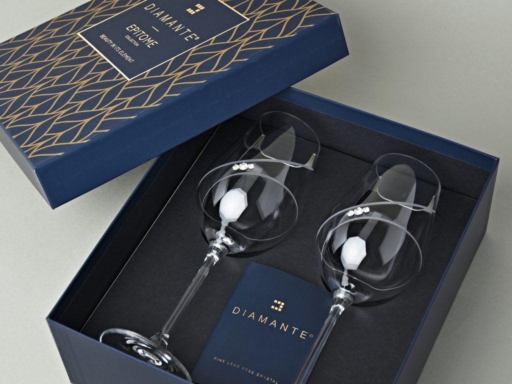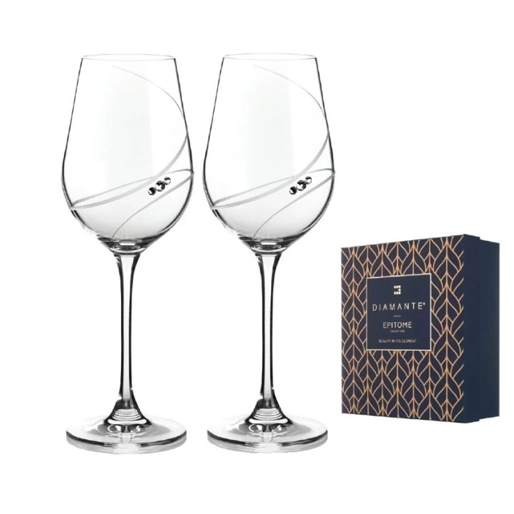 Luxusní set dvou sklenic na víno z kolekce Helix od Výrobce DIAMANTE. Dekorováno třemi krystaly Swarovski a ručně broušenou matnou spirálou, která se obtáčí elegantně okolo sklenice.