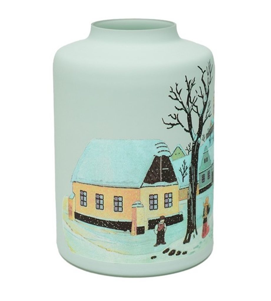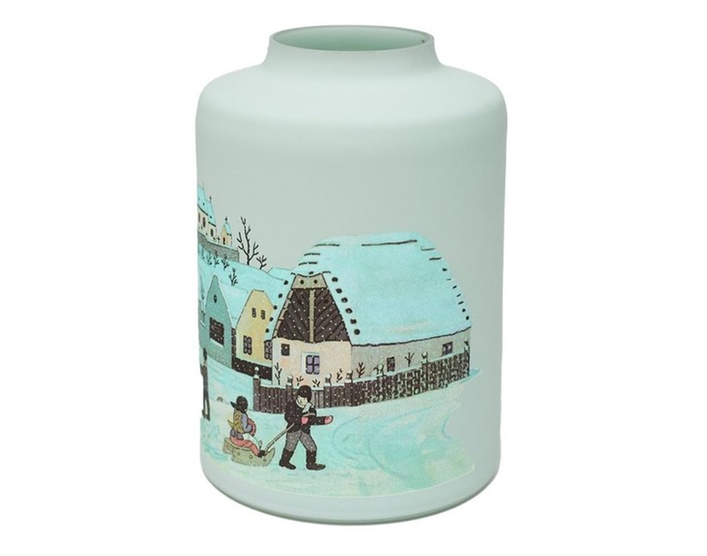 Skleněná váza v matné, světle modré barvě, s ilustrací Stavíme sněhuláka malíře Josefa Lady. Váza znikla unikátním spojením značky Decor by Glassor s rodinou malíře Josefa Lady. Váza patří do licencované kolekce Ladovy Vánoce, která spojuje nejmilejší zimní ilustrace s vánočními ozdobami, dekoracemi a bytovými doplňky.