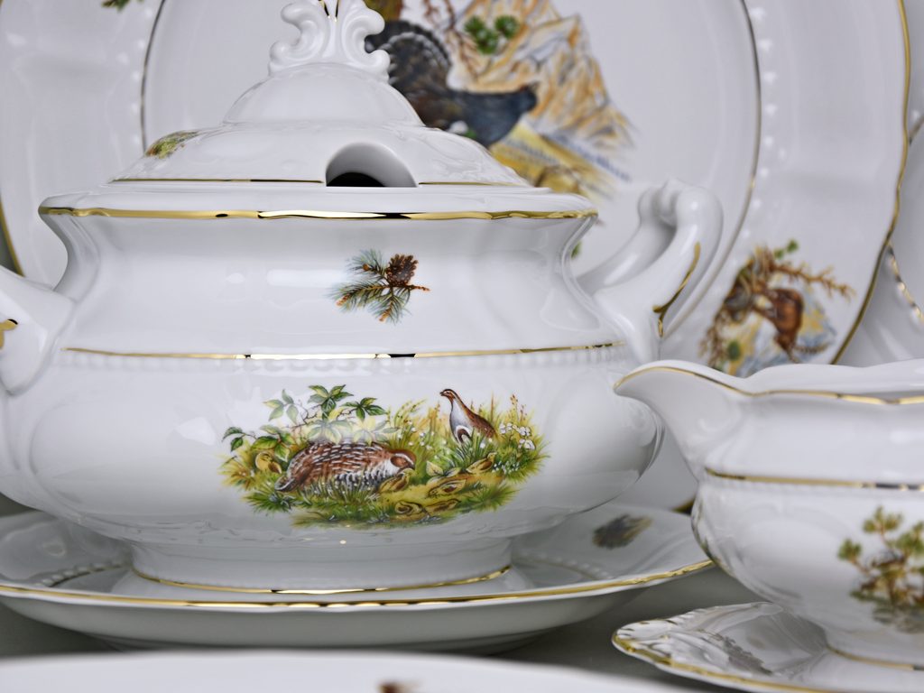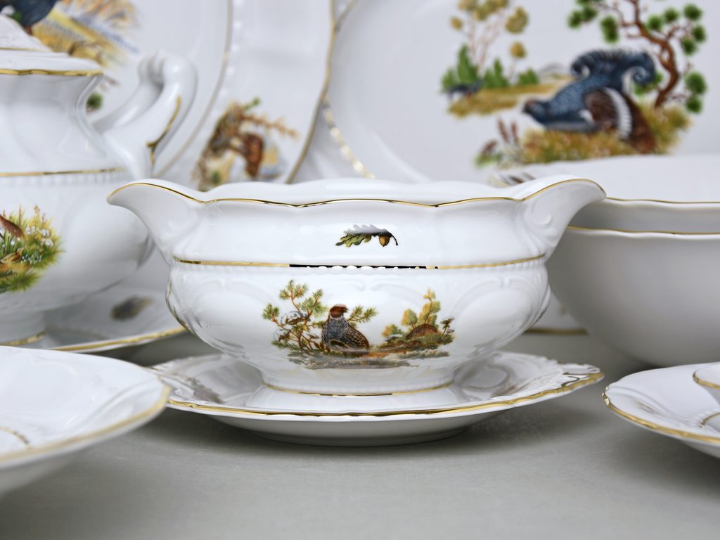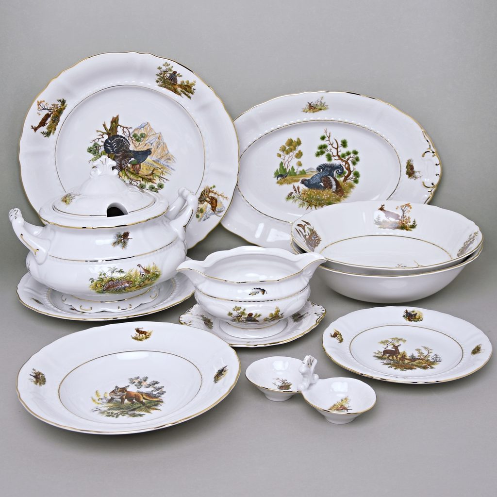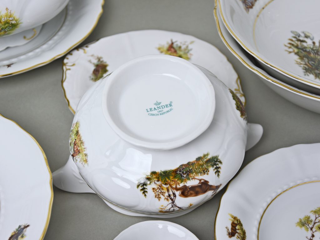 Špičkové jídelní souprava Sonáta s mysliveckým dekorem - 6 různých motivů na talířích + zlatá linka: 6x talíř mělký 25 cm, 6x talíř hluboký 23 cm, 6x talíř dezertní 19 cm, mísa polévková 2,5 l, ovál 36 cm, mísa mělká kulatá 32 cm, omáčník 350 ml + podomáčník, 2x mísa hluboká salátová/kompotová 26 cm, mistička sůl/pepř