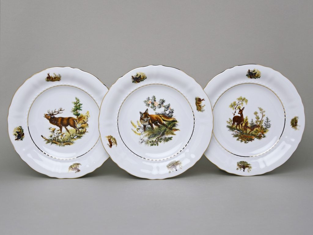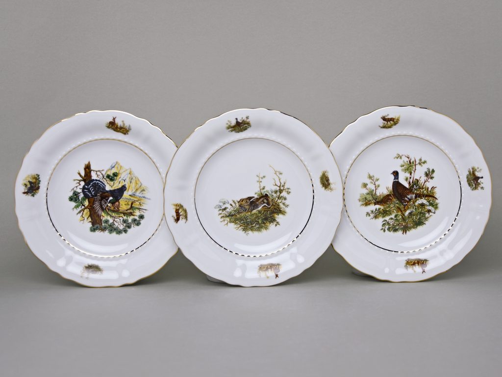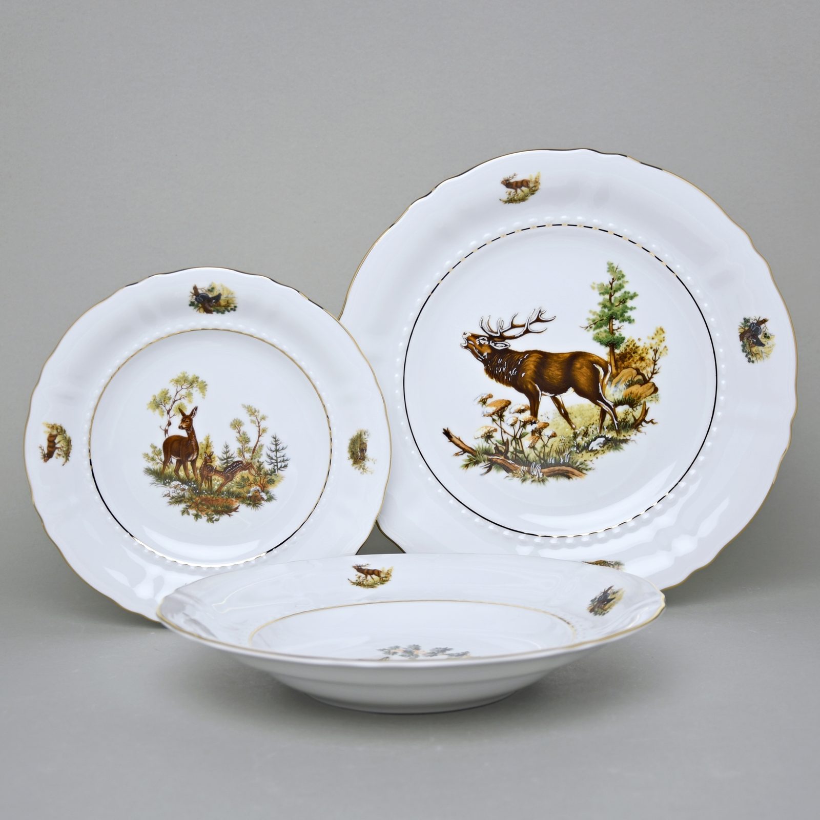 Špičkové talíře tvar Sonáta s mysliveckým dekorem (18 ks.) - 6 různých motivů + zlatá linka