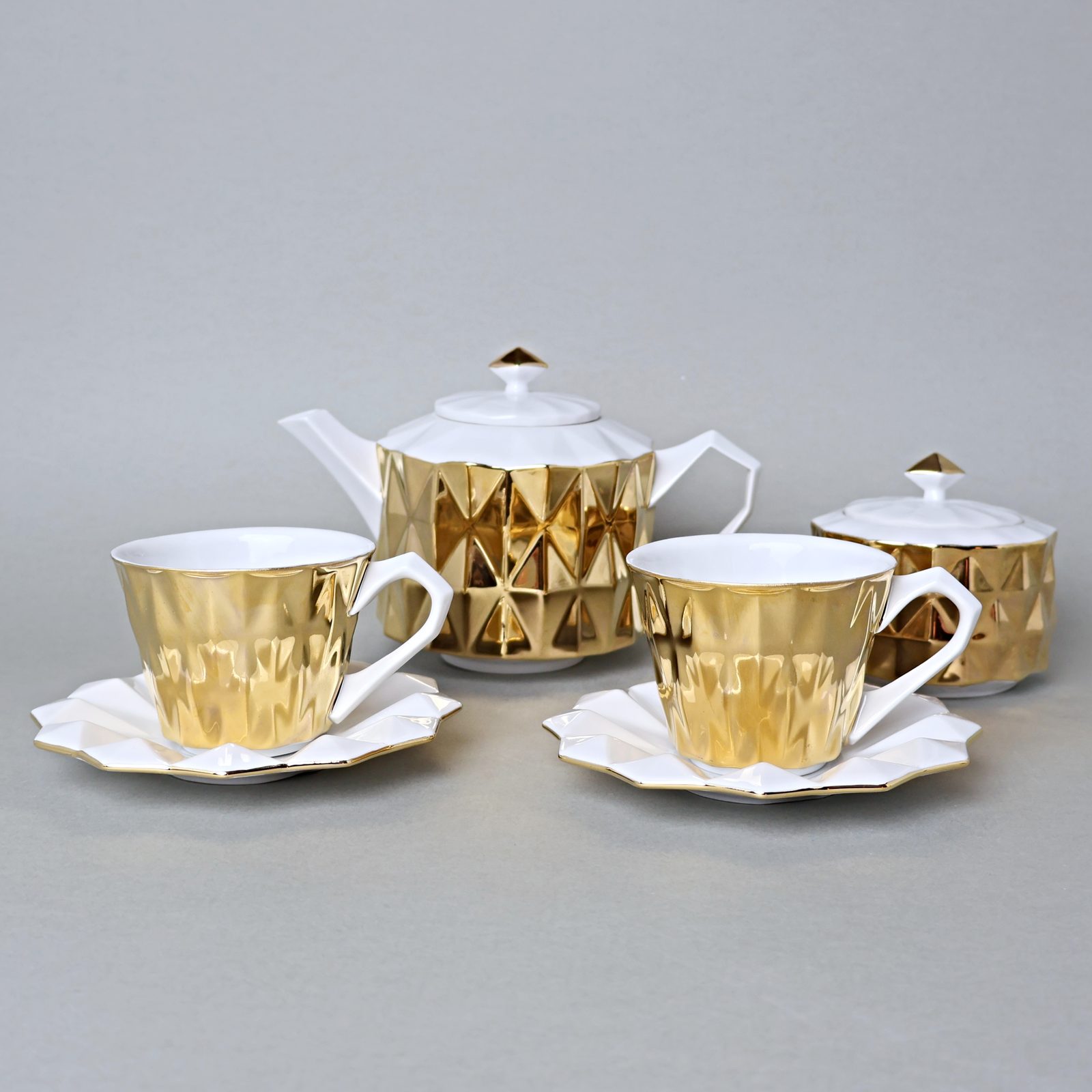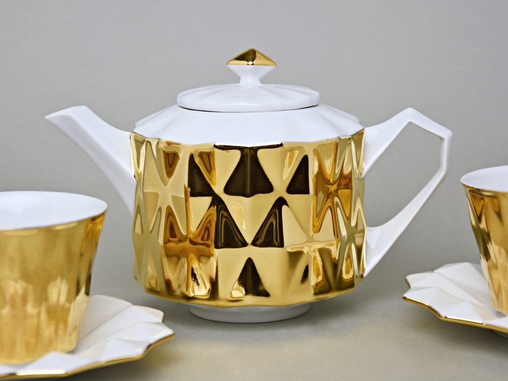 Čajový / kávový set Diamond pro dvě osoby. Originálního design této sady vychází z tradice českého kubismu ve stylu art deco, dekor bílá + malinké černé tečky.