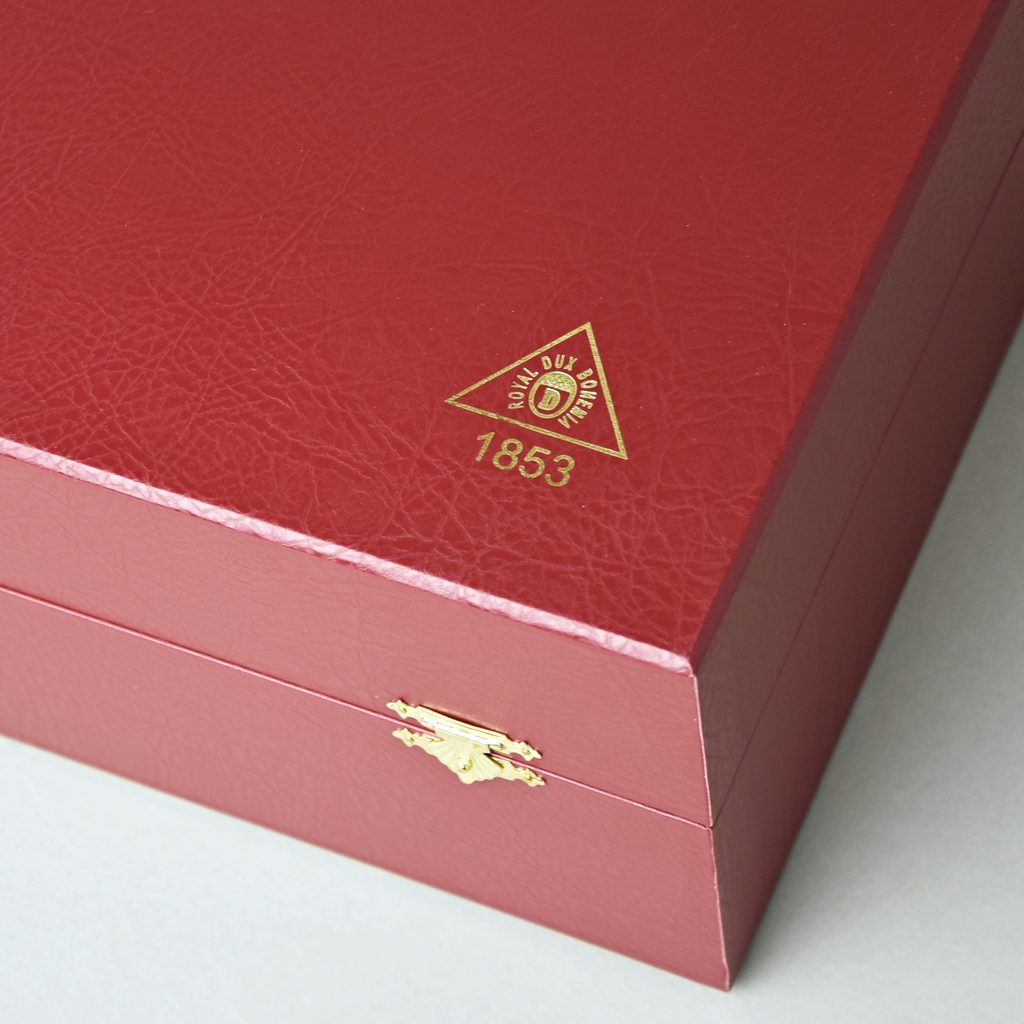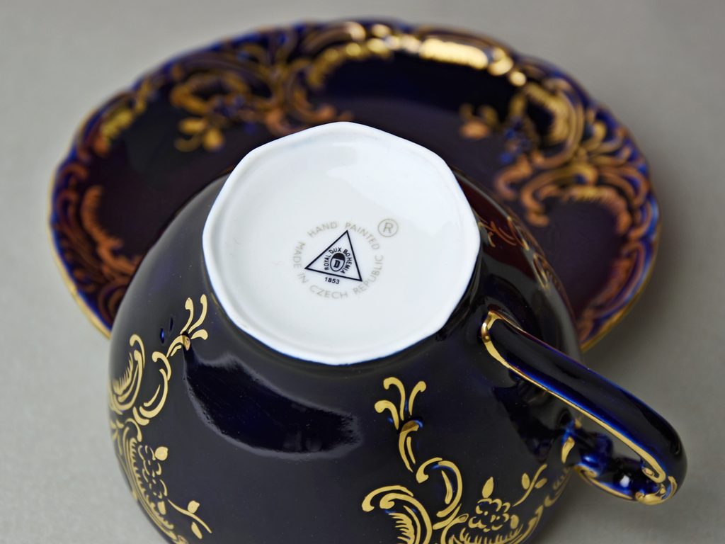 Zlatou barvou a kobaltovou modří dekorovaný šálek a podšálek v krásné sadě po dvou v dárkovém kufříku vykladeném rudou semišovou látkou. Jedinečný český výrobek ještě z porcelánky v Duchcově.
