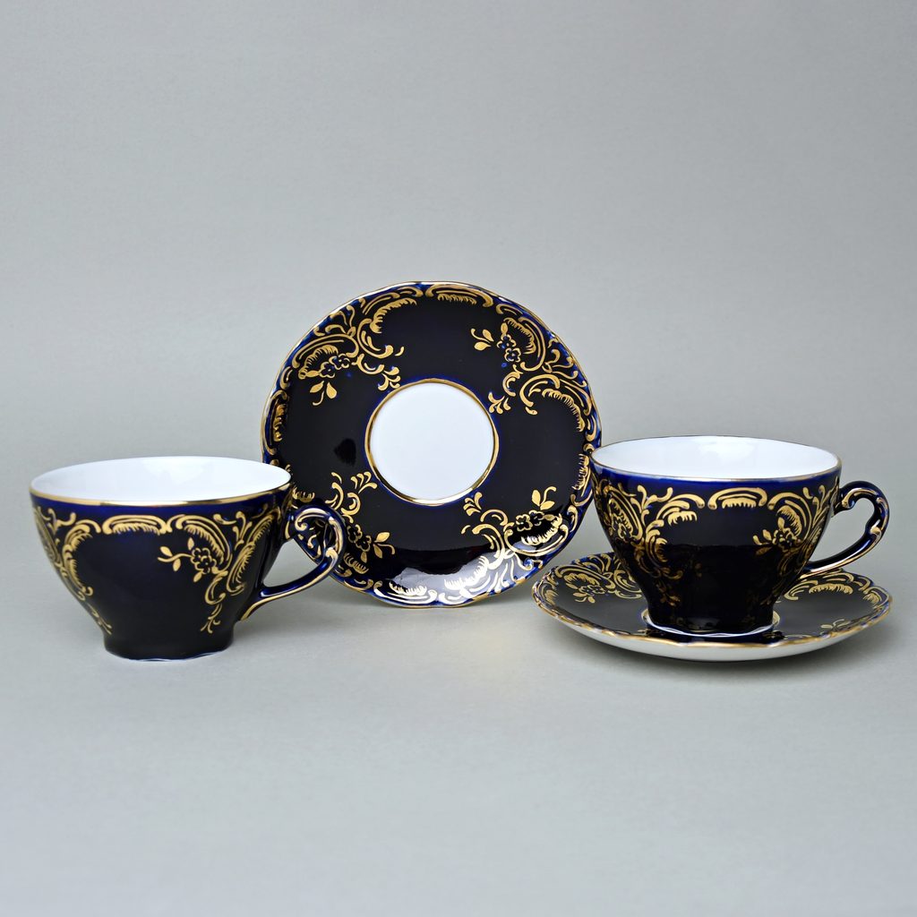 Souprava Šálek 200 ml a podšálek čajový, 2ks. Opera kobaltová modř + zlato, Dárkové balení, Český porcelán a.s. (Royal Dux Bohemia)