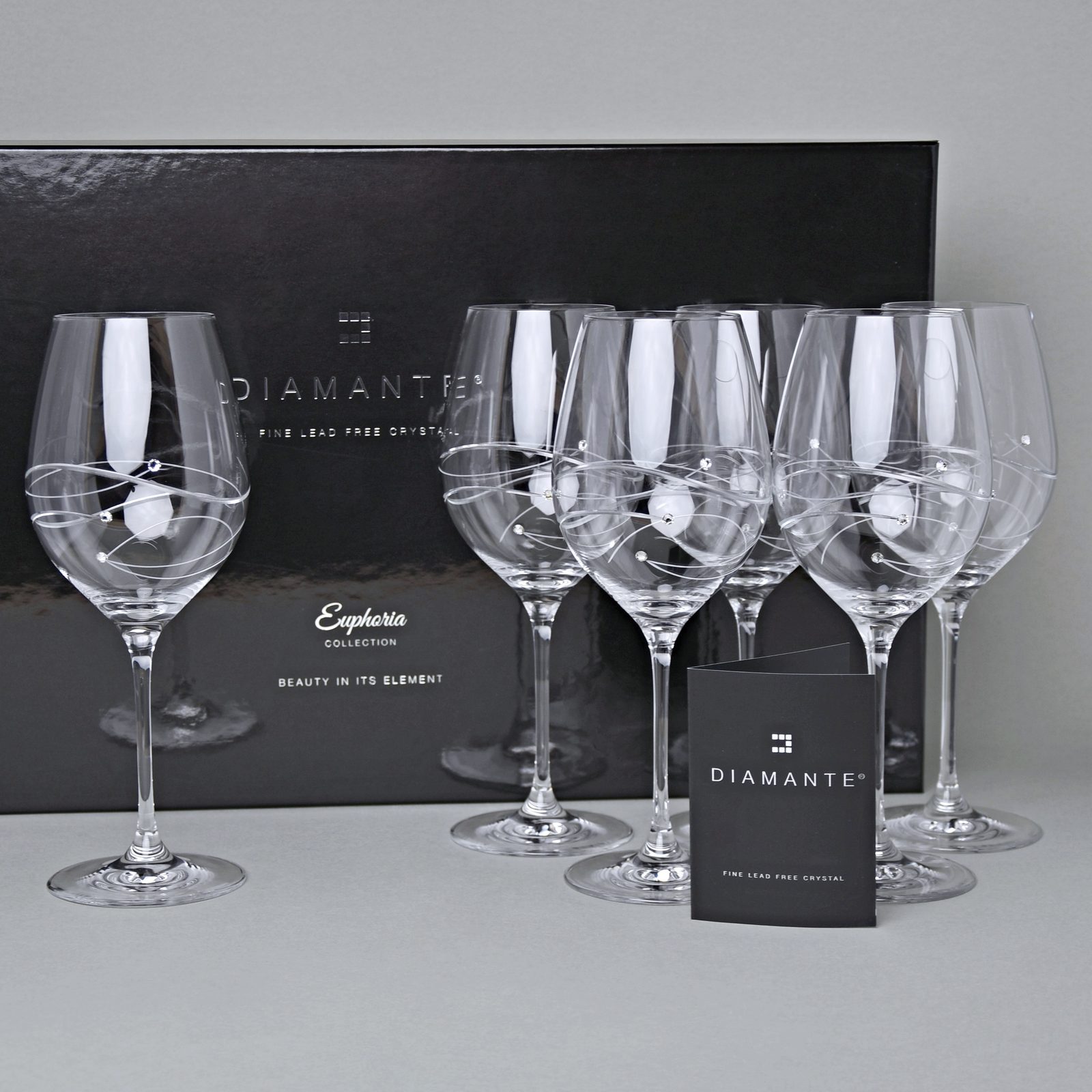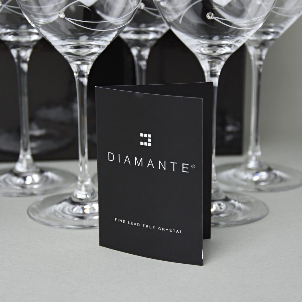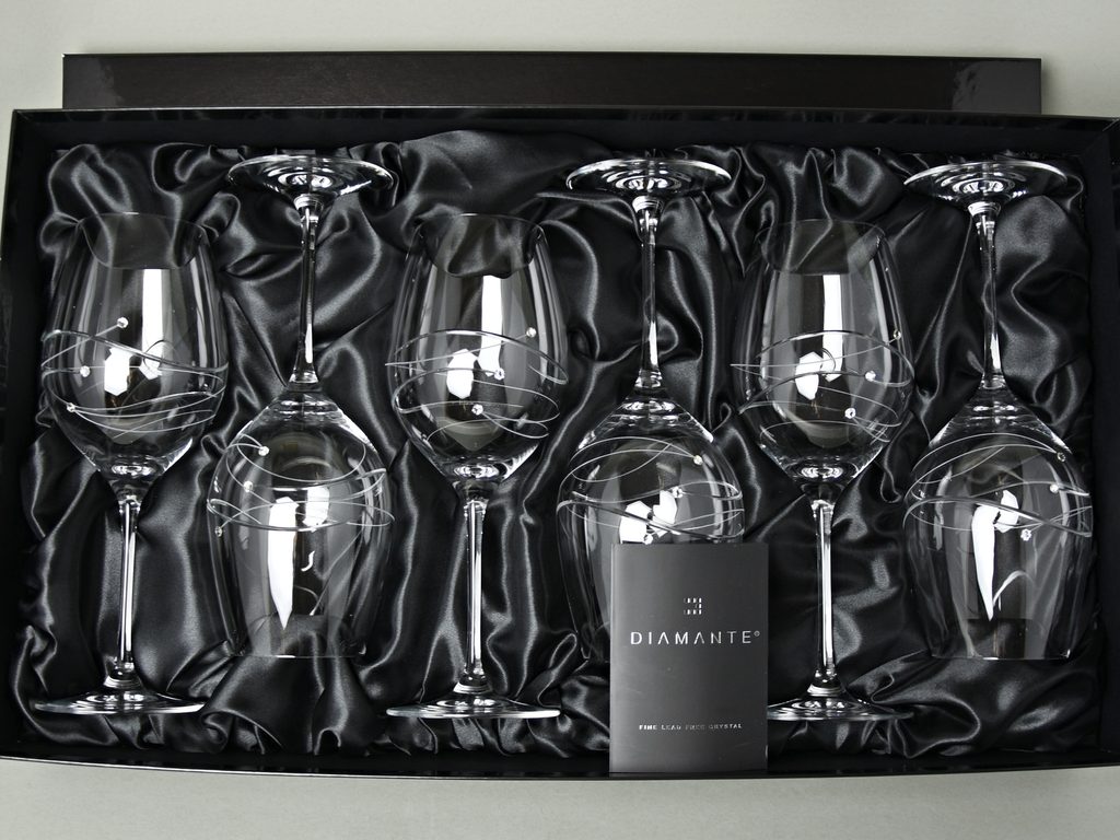 Luxusní set 6 sklenic na červené víno Diamante z kolekce Spiral. Dekorováno krystaly Swarovski a ručně broušenými linkami, které se obtáčí elegantně okolo sklenice. Baleno v luxusní dárkové krabici.