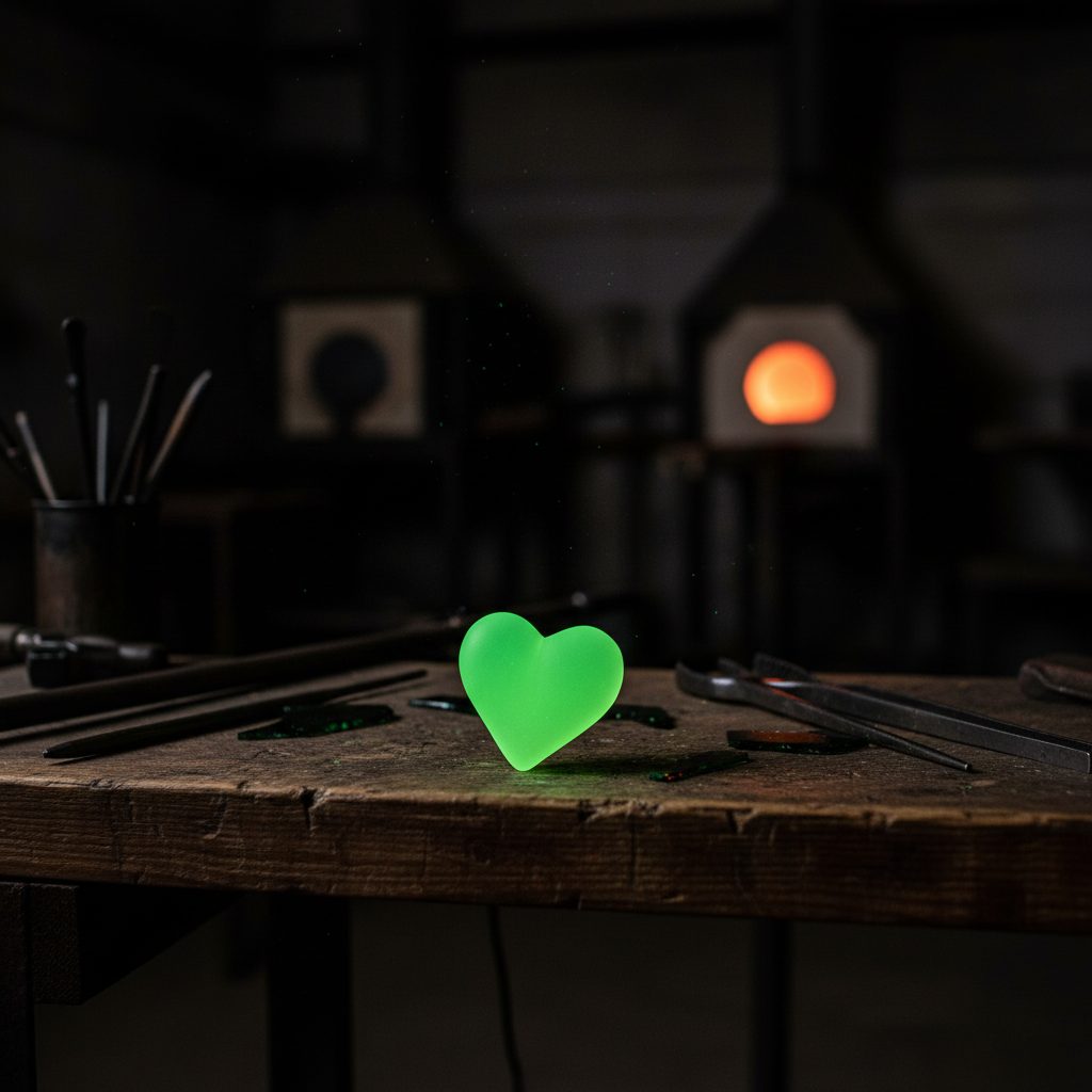 Dekorativní skleněné srdíčko z pravého uranového skla, ručně vyrobené ve Sklárně Janov.