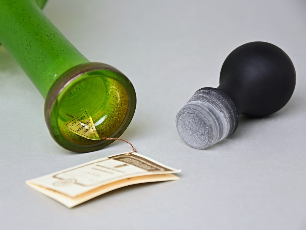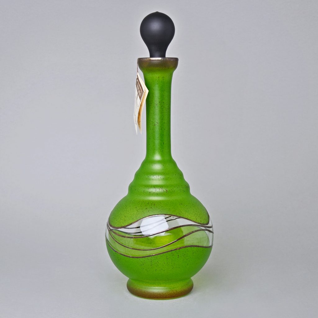 Zdobená skleněná karafa / dekantér s uzávěrem, české sklo dekorované ve sklářském Studiu Miracle, které se zabývá výhradně ručním dekorováním skleněných výrobků za použití zcela nové techniky dekorování - aplikace kovů v kombinaci s barevnými plochami. Autorka originálních dekorů je sama paní majitelka Vlasta Voborníková. Vysokou estetickou, užitnou i řemeslnou úroveň prokazuje udělení již několika ocenění Studiu Miracle.
