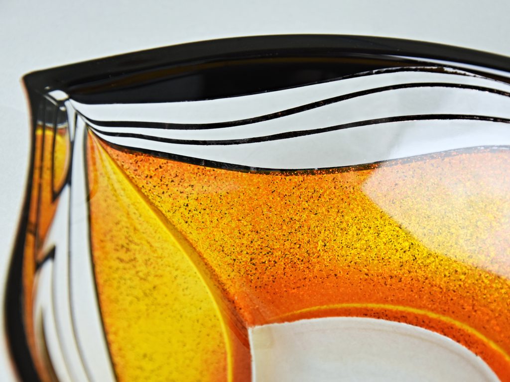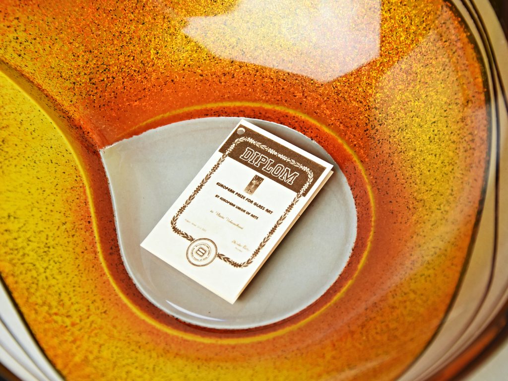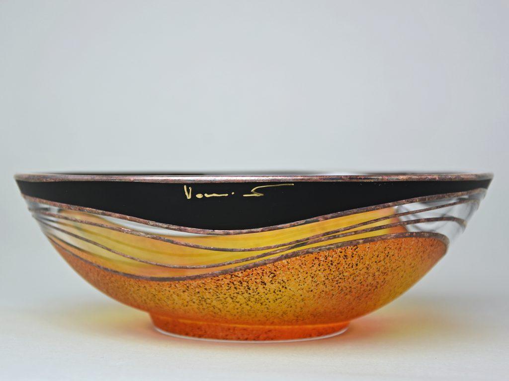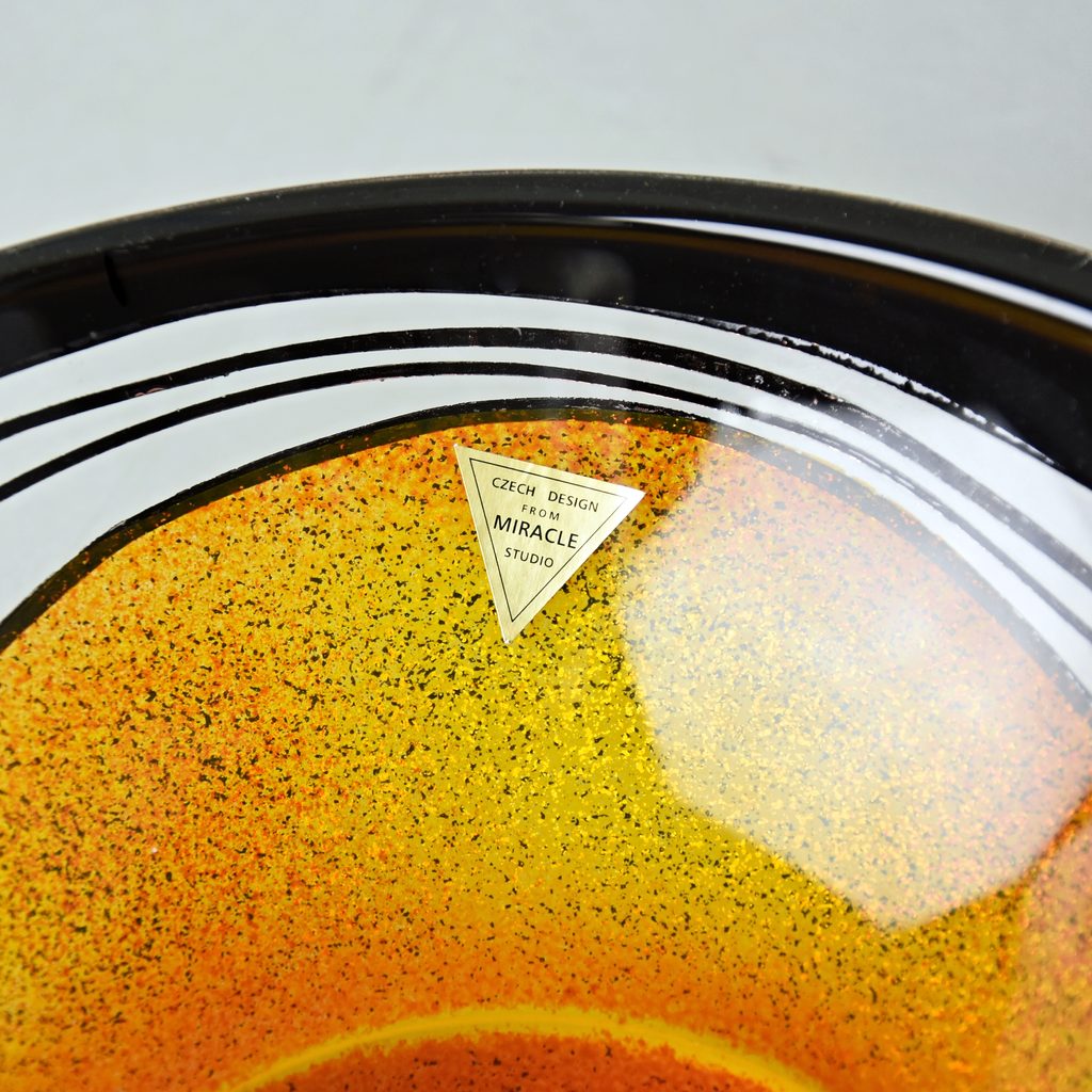 Zdobená skleněná mísa, české sklo dekorované ve sklářském Studiu Miracle, které se zabývá výhradně ručním dekorováním skleněných výrobků za použití zcela nové techniky dekorování - aplikace kovů v kombinaci s barevnými plochami. Autorka originálních dekorů je sama paní majitelka Vlasta Voborníková. Vysokou estetickou, užitnou i řemeslnou úroveň prokazuje udělení již několika ocenění Studiu Miracle.