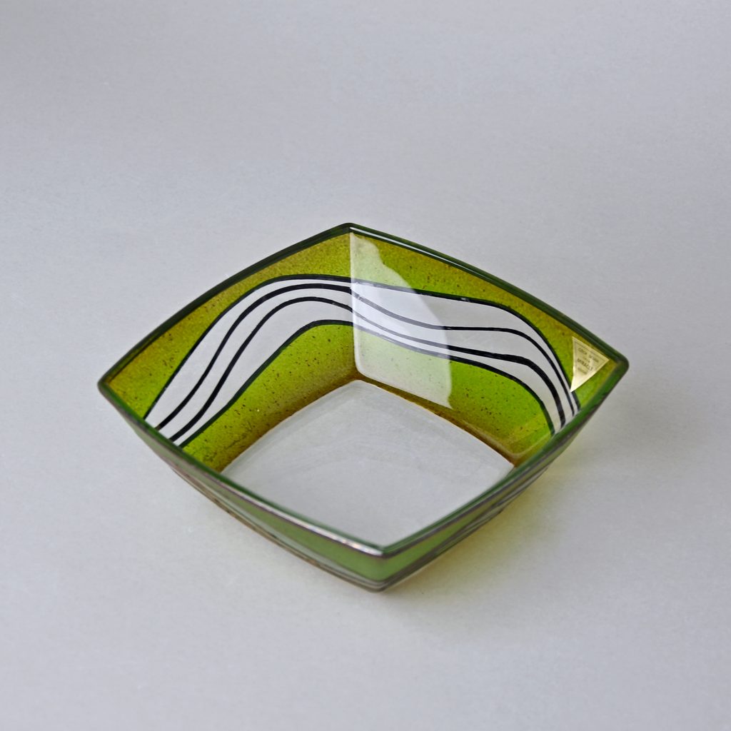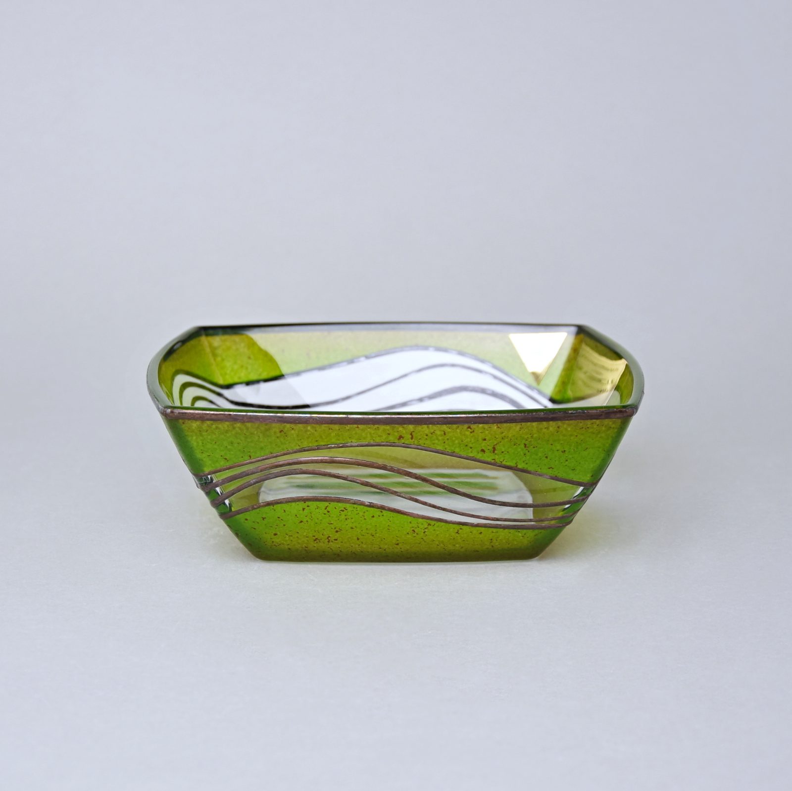 Zdobená skleněná čtyřhranná mísa, české sklo dekorované ve sklářském Studiu Miracle, které se zabývá výhradně ručním dekorováním skleněných výrobků za použití zcela nové techniky dekorování - aplikace kovů v kombinaci s barevnými plochami. Autorka originálních dekorů je sama paní majitelka Vlasta Voborníková. Vysokou estetickou, užitnou i řemeslnou úroveň prokazuje udělení již několika ocenění Studiu Miracle.