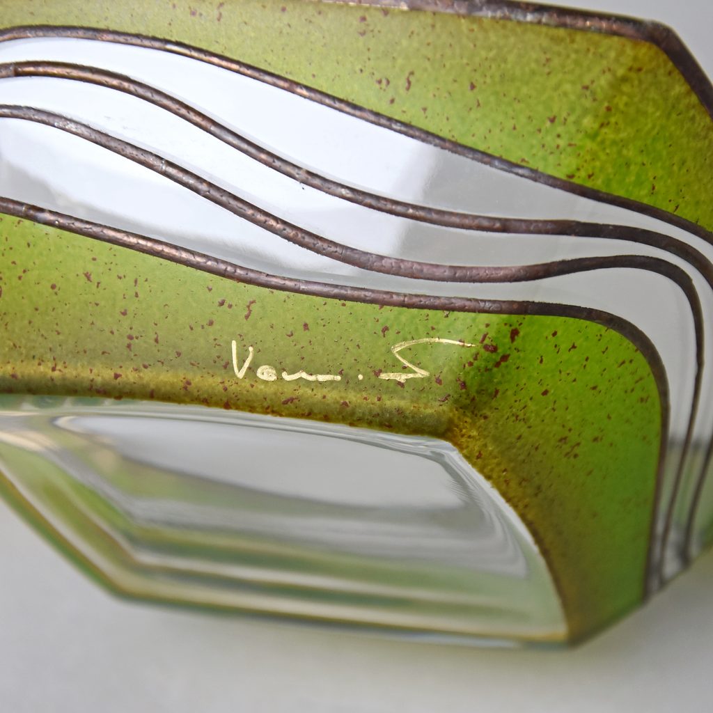 Dekor zeleno-hnědá + kovové plastické vlnovky. Výrobek je autorsky signován, opatřený certifikátem originality.