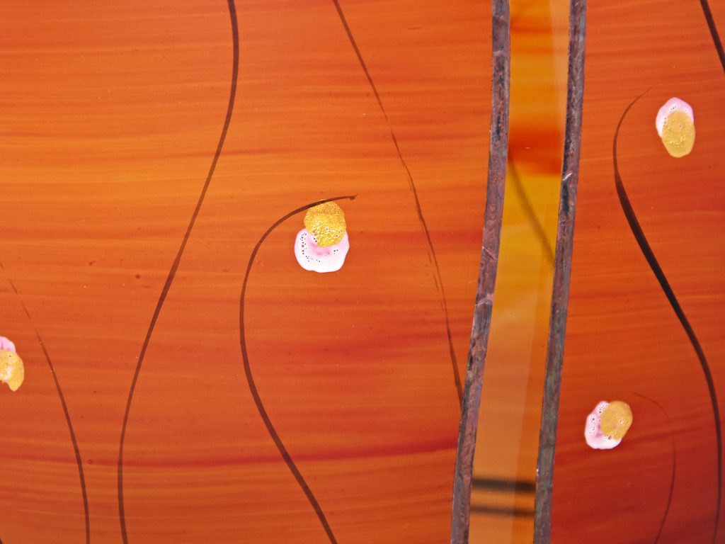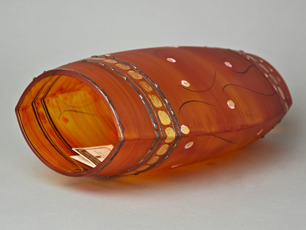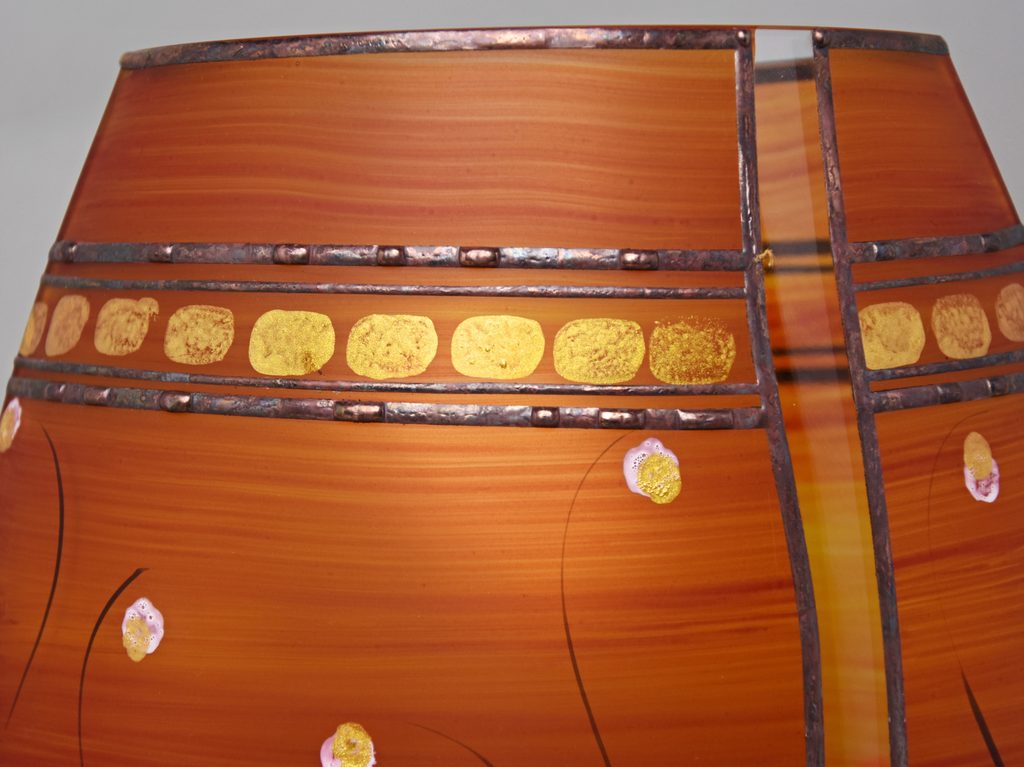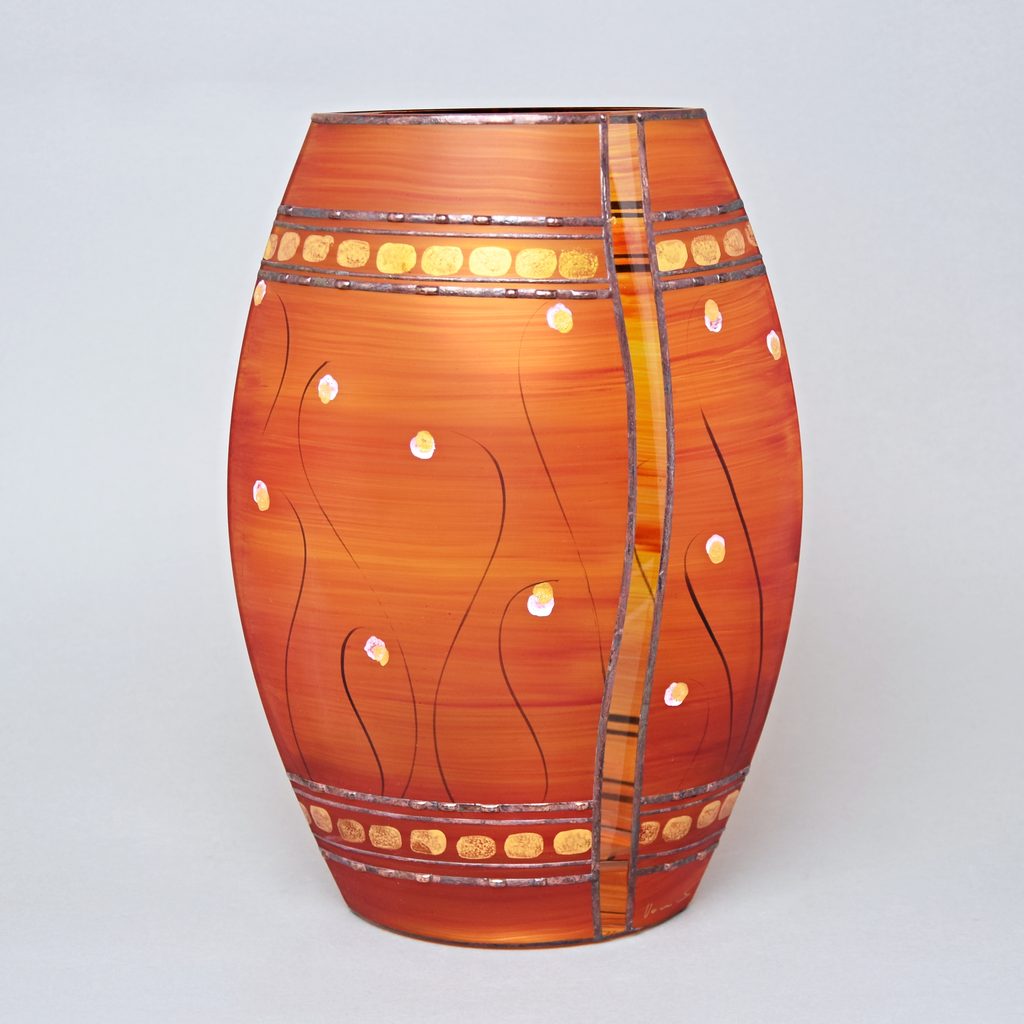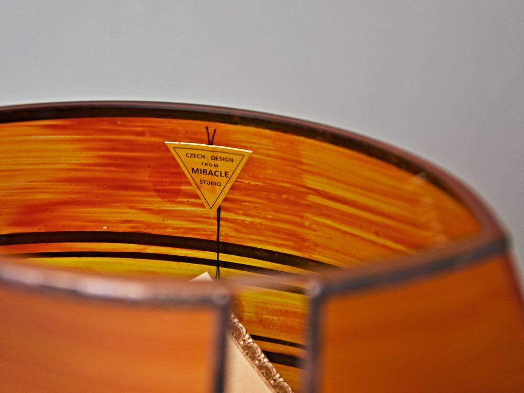 Zdobená skleněná váza, české sklo dekorované ve sklářském Studiu Miracle, které se zabývá výhradně ručním dekorováním skleněných výrobků za použití zcela nové techniky dekorování - aplikace kovů v kombinaci s barevnými plochami. Autorka originálních dekorů je sama paní majitelka Vlasta Voborníková. Vysokou estetickou, užitnou i řemeslnou úroveň prokazuje udělení již několika ocenění Studiu Miracle.