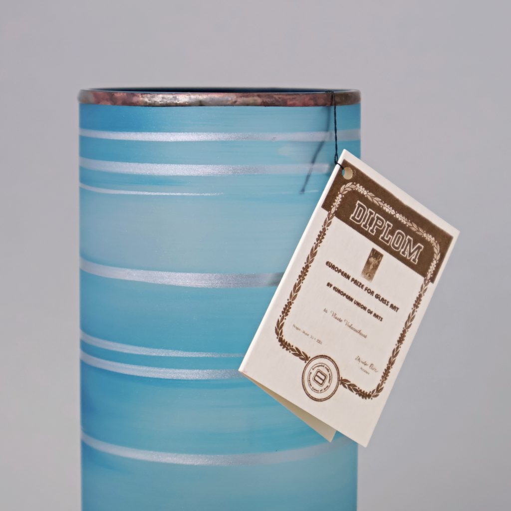 Zdobená skleněná váza, české sklo dekorované ve sklářském Studiu Miracle, které se zabývá výhradně ručním dekorováním skleněných výrobků za použití zcela nové techniky dekorování - aplikace kovů v kombinaci s barevnými plochami. Autorka originálních dekorů je sama paní majitelka Vlasta Voborníková. Vysokou estetickou, užitnou i řemeslnou úroveň prokazuje udělení již několika ocenění Studiu Miracle.