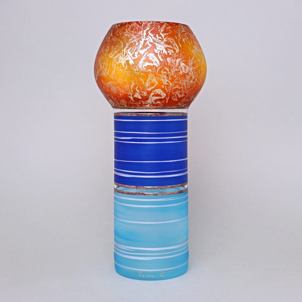 Zdobená skleněná váza, české sklo dekorované ve sklářském Studiu Miracle, které se zabývá výhradně ručním dekorováním skleněných výrobků za použití zcela nové techniky dekorování - aplikace kovů v kombinaci s barevnými plochami. Autorka originálních dekorů je sama paní majitelka Vlasta Voborníková. Vysokou estetickou, užitnou i řemeslnou úroveň prokazuje udělení již několika ocenění Studiu Miracle.