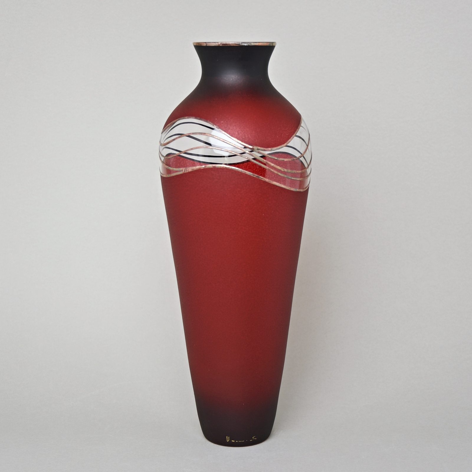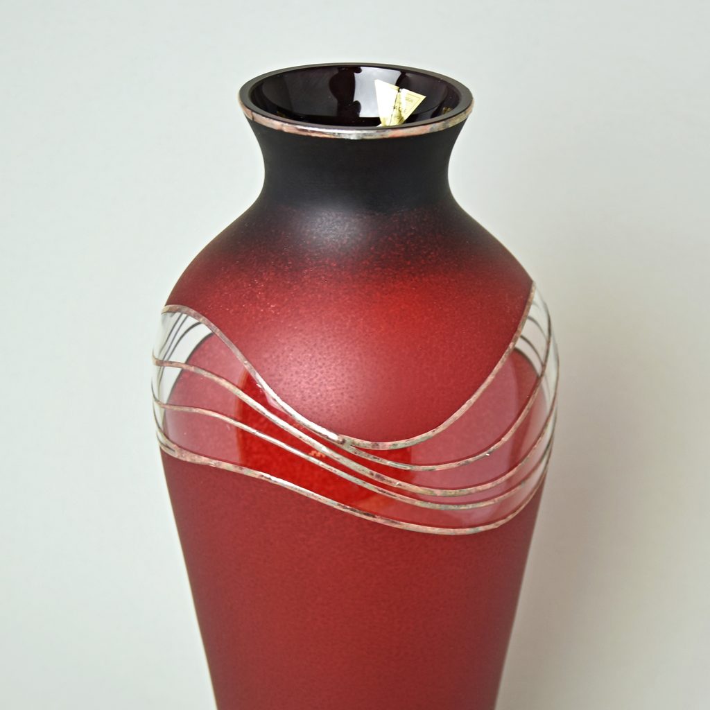 Opravdu vysoká krásná zdobená skleněná váza, české sklo dekorované ve sklářském Studiu Miracle, které se zabývá výhradně ručním dekorováním skleněných výrobků za použití zcela nové techniky dekorování - aplikace kovů v kombinaci s barevnými plochami. Autorka originálních dekorů je sama paní majitelka Vlasta Voborníková. Vysokou estetickou, užitnou i řemeslnou úroveň prokazuje udělení již několika ocenění Studiu Miracle.