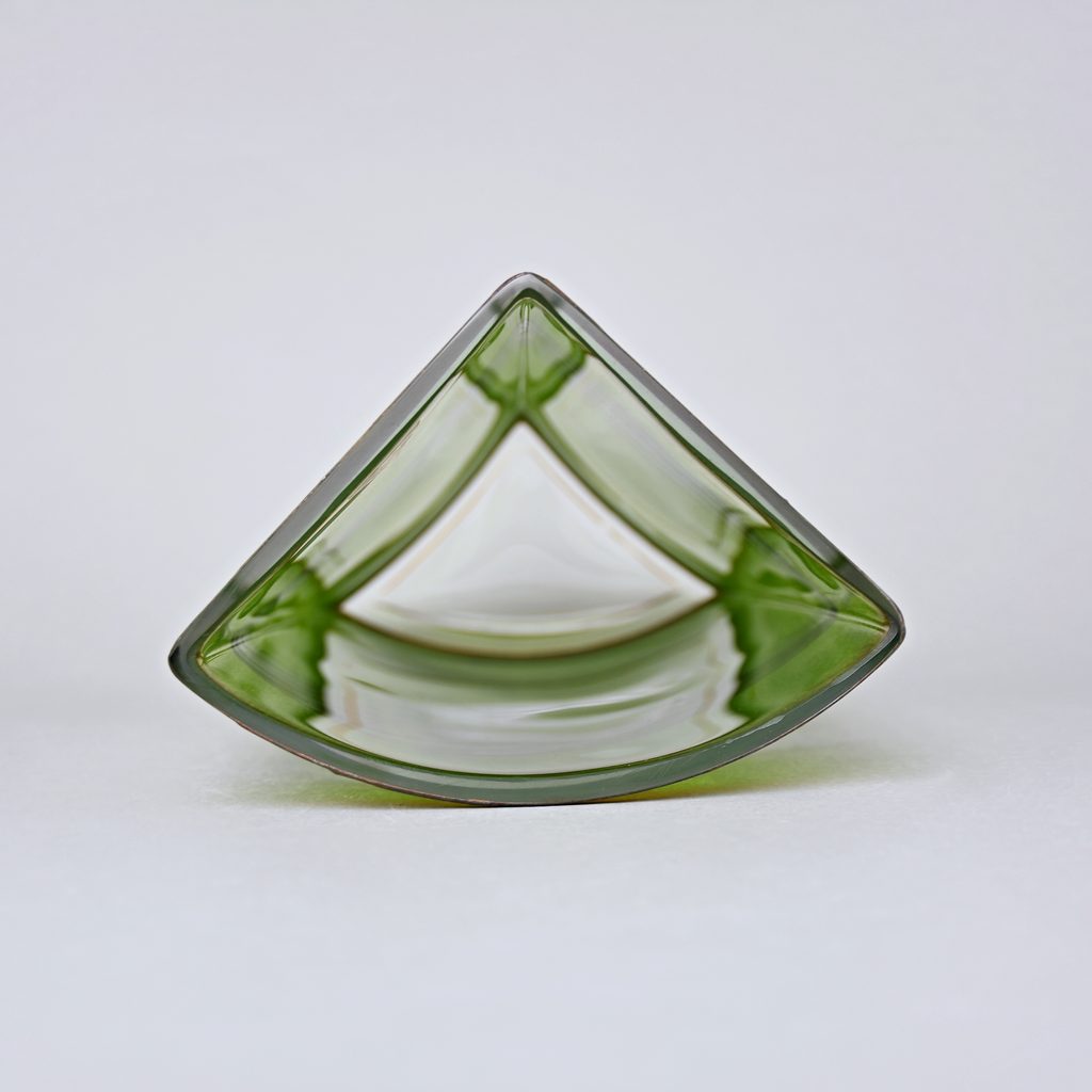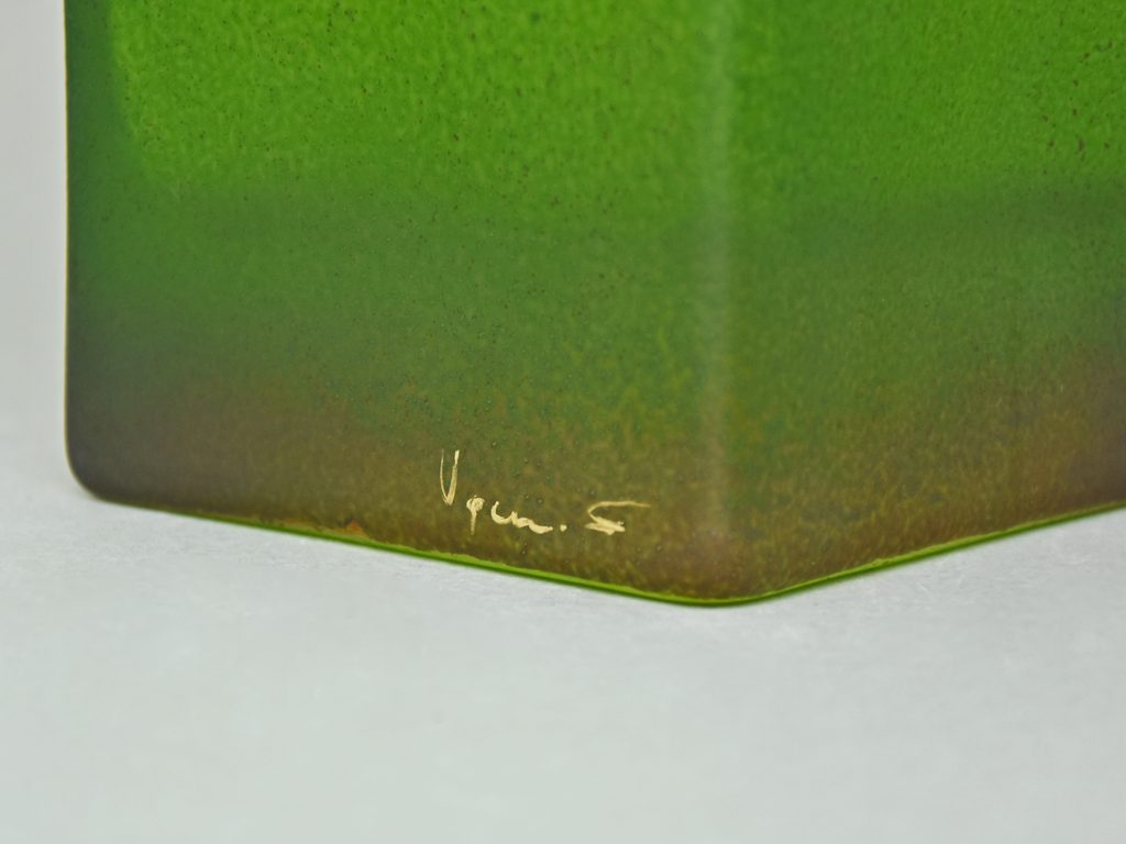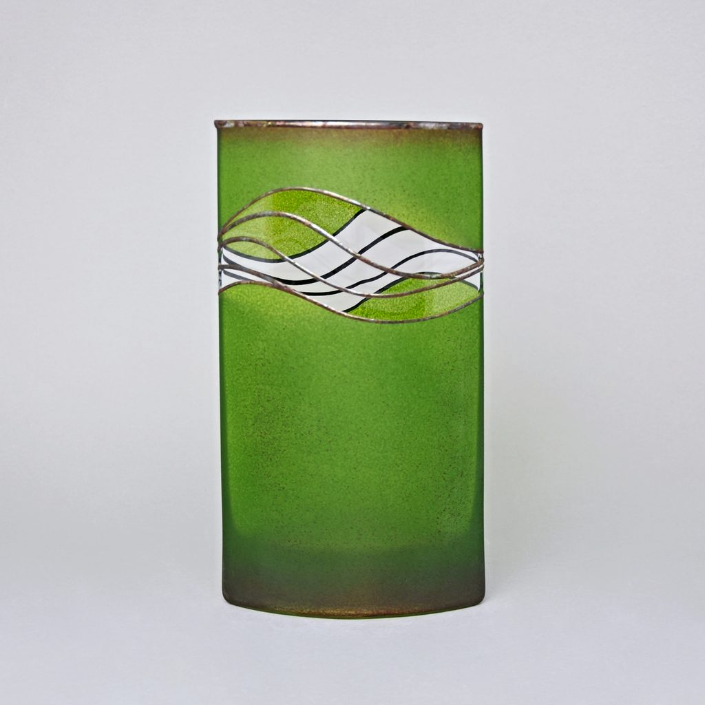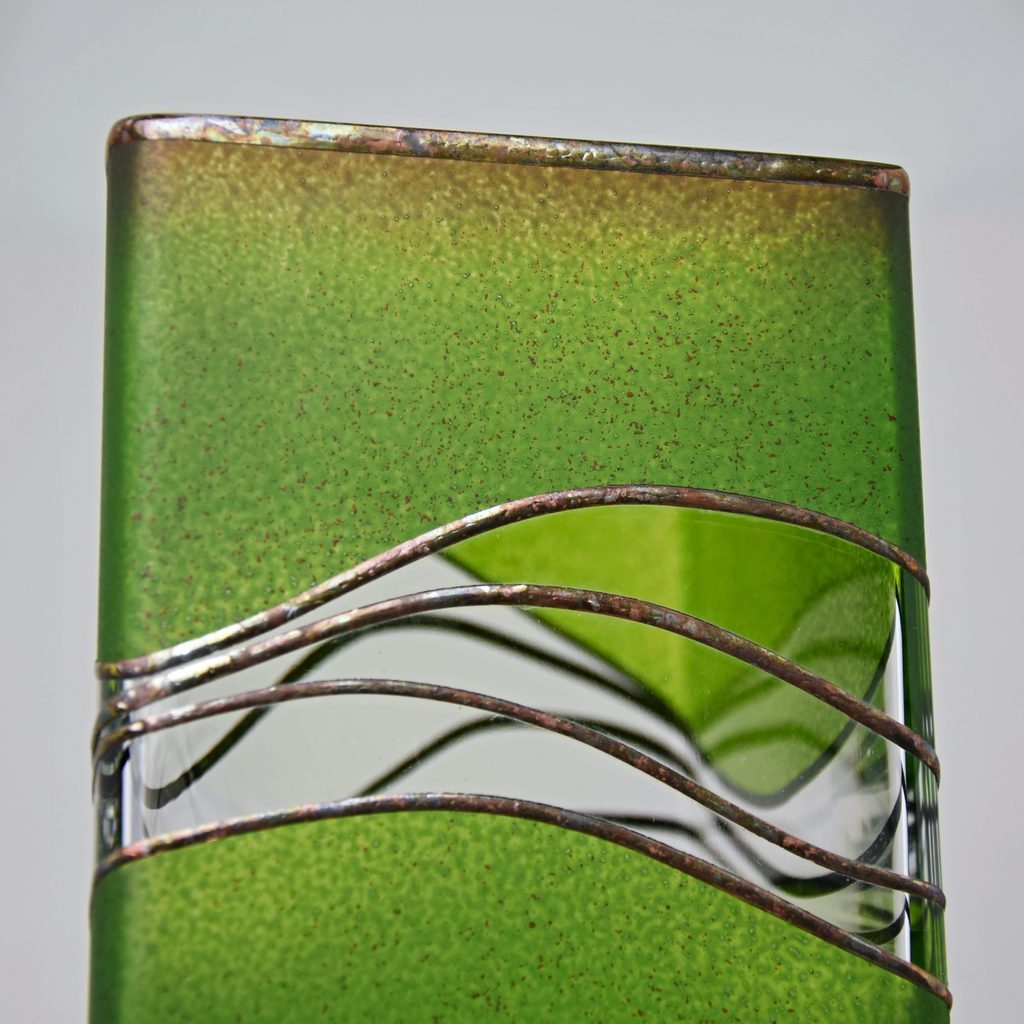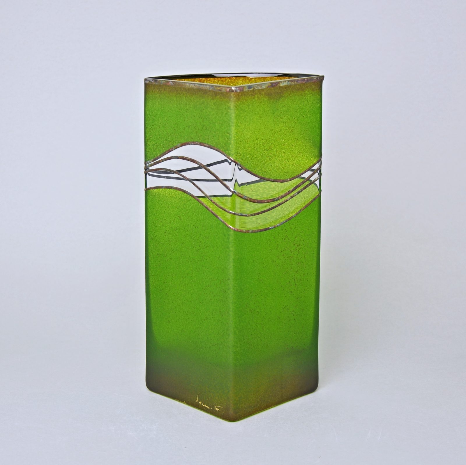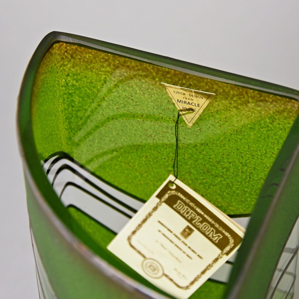 Zdobená skleněná váza trojúhelníkového tvaru, české sklo dekorované ve sklářském Studiu Miracle, které se zabývá výhradně ručním dekorováním skleněných výrobků za použití zcela nové techniky dekorování - aplikace kovů v kombinaci s barevnými plochami. Autorka originálních dekorů je sama paní majitelka Vlasta Voborníková. Vysokou estetickou, užitnou i řemeslnou úroveň prokazuje udělení již několika ocenění Studiu Miracle.