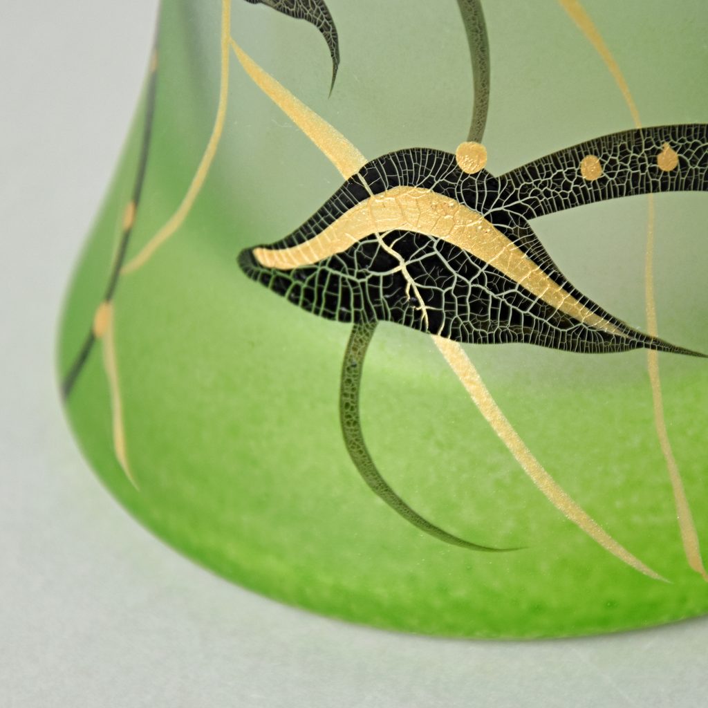 Zdobená skleněná váza, české sklo dekorované ve sklářském Studiu Miracle, které se zabývá výhradně ručním dekorováním skleněných výrobků za použití zcela nové techniky dekorování - aplikace kovů v kombinaci s barevnými plochami. Autorka originálních dekorů je sama paní majitelka Vlasta Voborníková. Vysokou estetickou, užitnou i řemeslnou úroveň prokazuje udělení již několika ocenění Studiu Miracle.