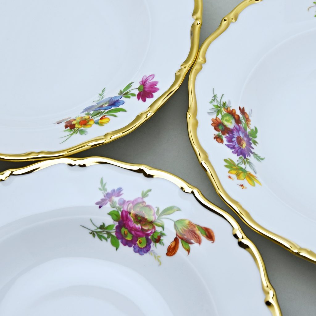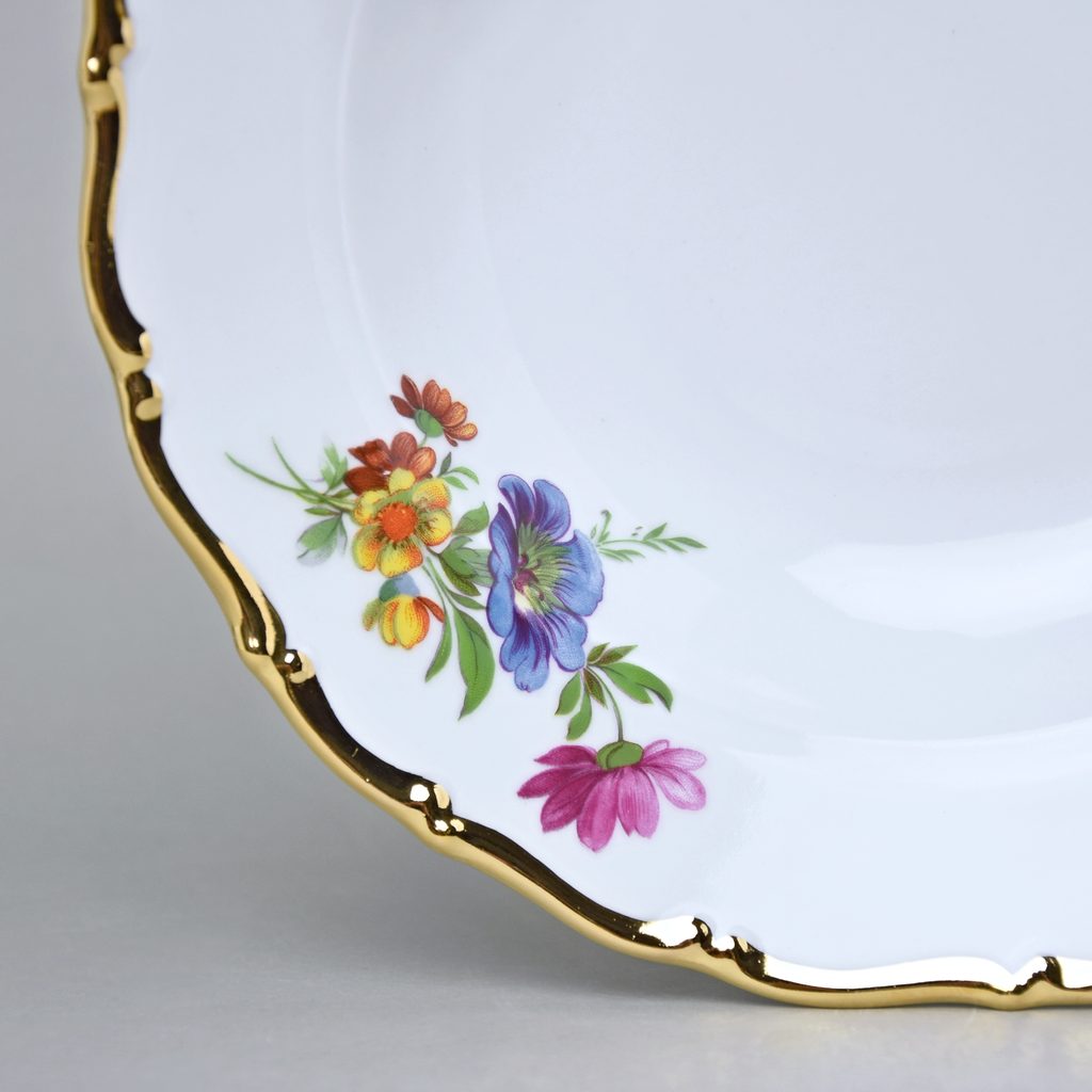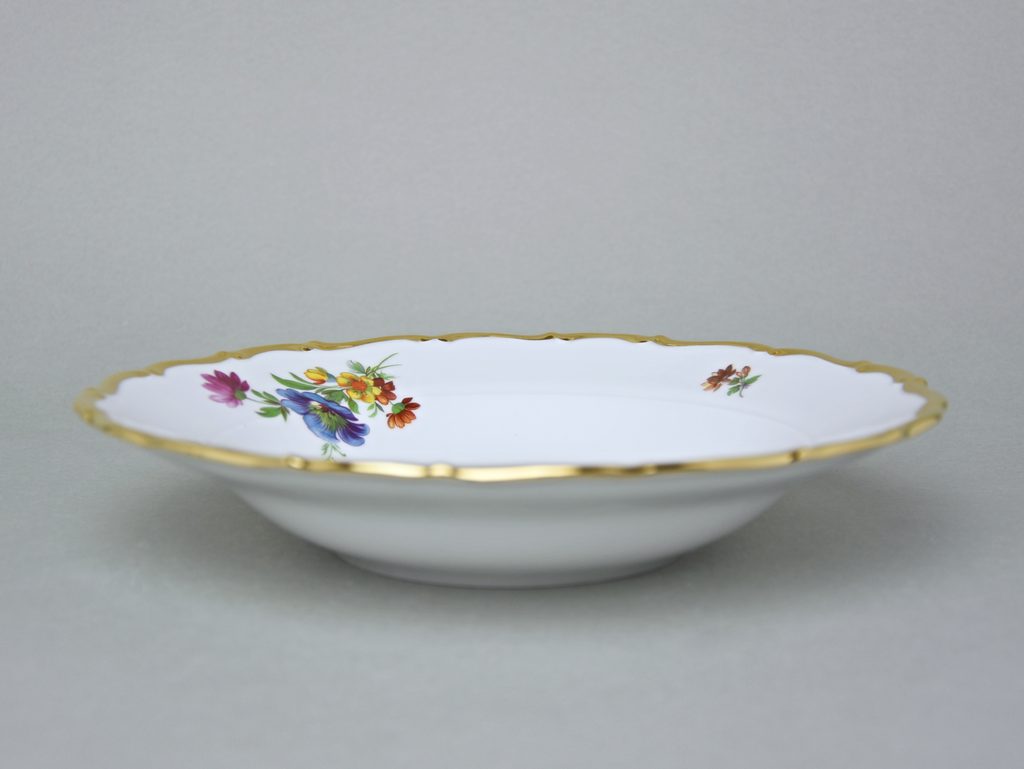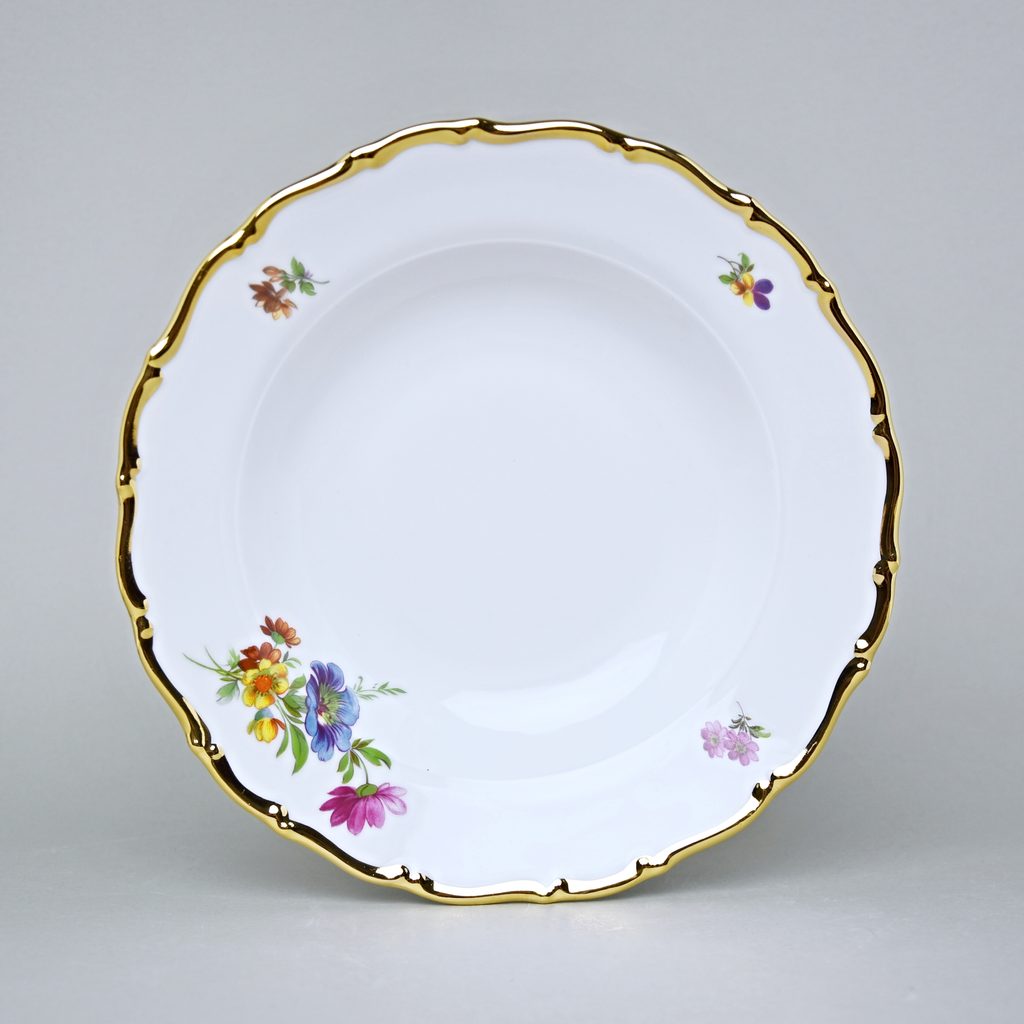 Zdobný hluboký talíř na polévku o průměru 24 cm z kolekce Aristokrat - květinový dekor se zlatem. Malá česká porcelánka Queens Crown.