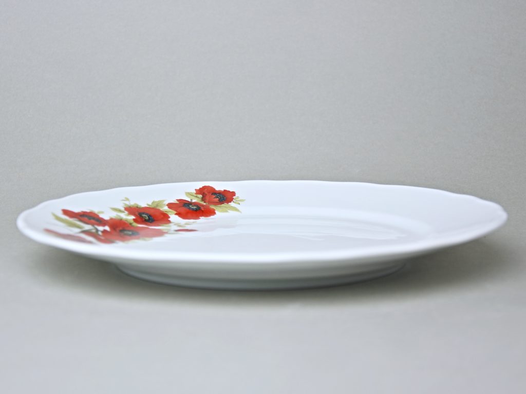 Mělký talíř o průměru 26 cm na hlavní chod ve tvaru Rokoko (na který se dekoruje pravý cibulák). Květinový dekor Vlčích máků. Český porcelán a.s. z Dubí.
