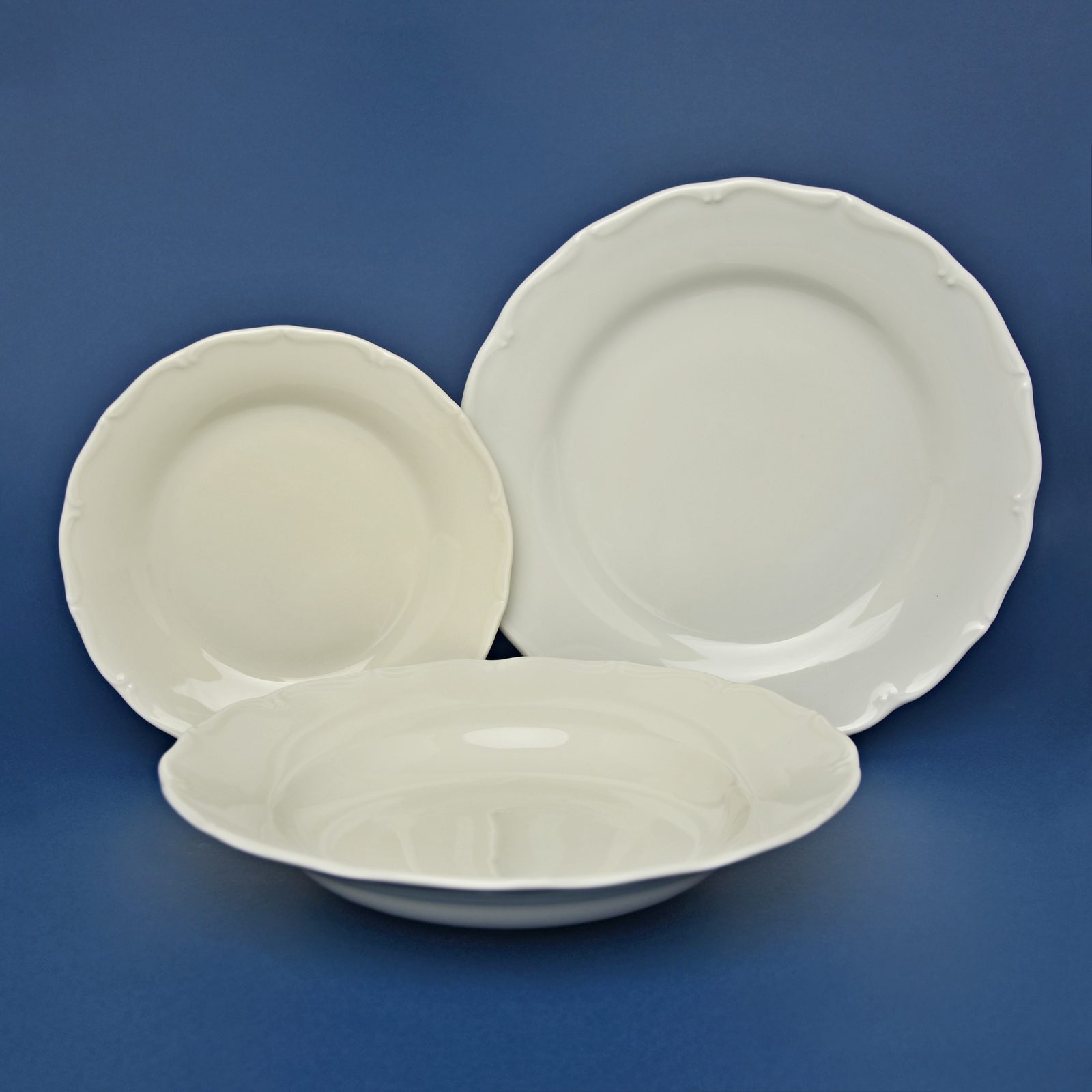 krásný s jemným reliéfem po okraji zdobený porcelán Verona ve slonové kosti (jemně béžový) - 6x talíř mělký 25 cm, 6x talíř hluboký 24 cm, 6x talíř dezertní 19 cm - sada obsahuje klasické rozměry jídelních talířů obvykle užívaných v našich končinách