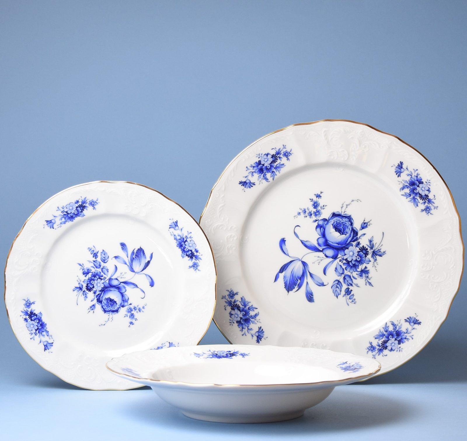 6x talíř mělký 25 cm, 6x talíř hluboký 23 cm, 6x talíř dezertní 19 cm, bájná modrá růže (neexistuje a nedaří se vyšlechtit) na porcelánu Bernadotte z Lesova