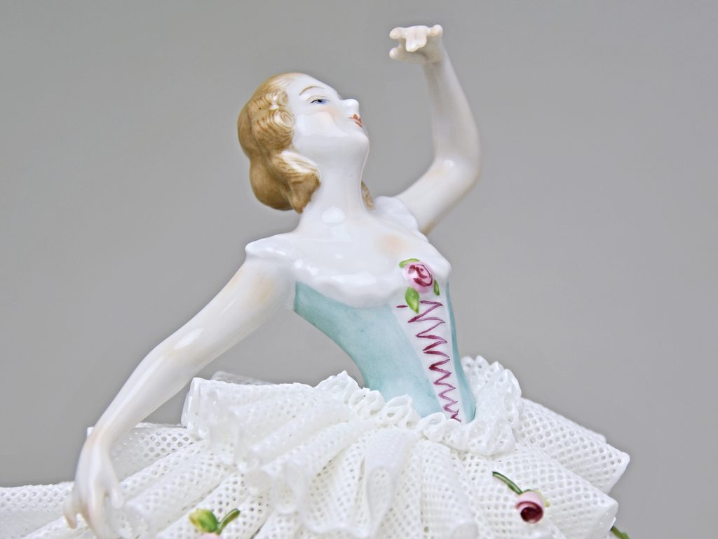 Krásná a elegantní porcelánová figurka tanečnice s krajkovou sukní od designéra Kurta Steinera z Unterwissbacher Werkstatten fur Porzellankunst, která vznikla roku 1882.