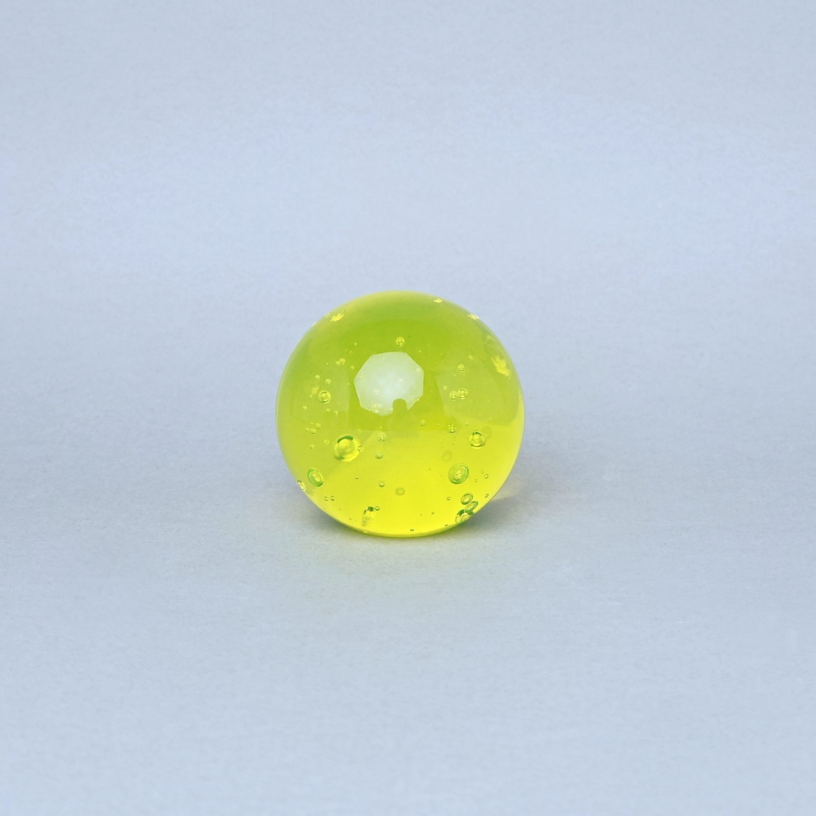 Dekorativní skleněné těžítko Koule s bublinkami z pravého uranového skla, ručně vyrobené ve Sklárně Janov.