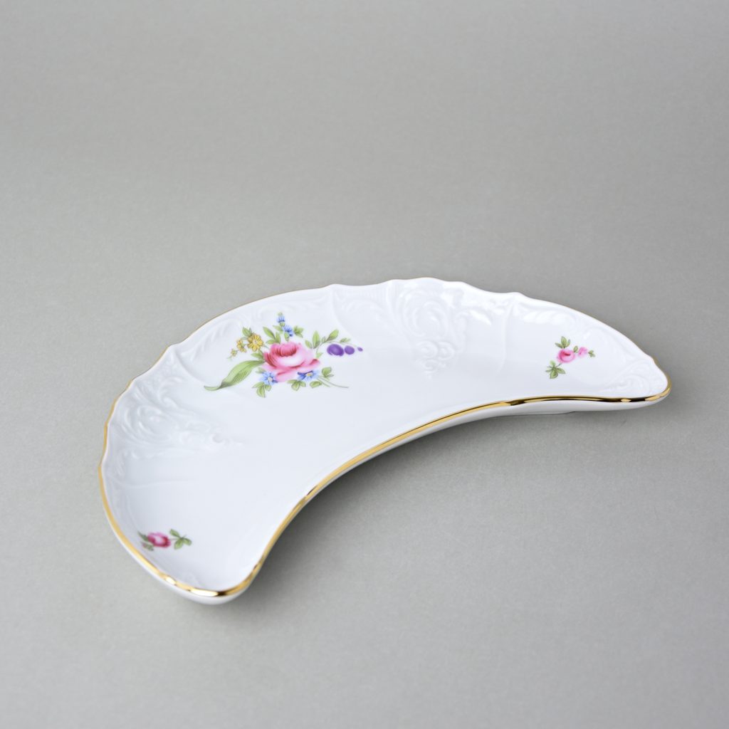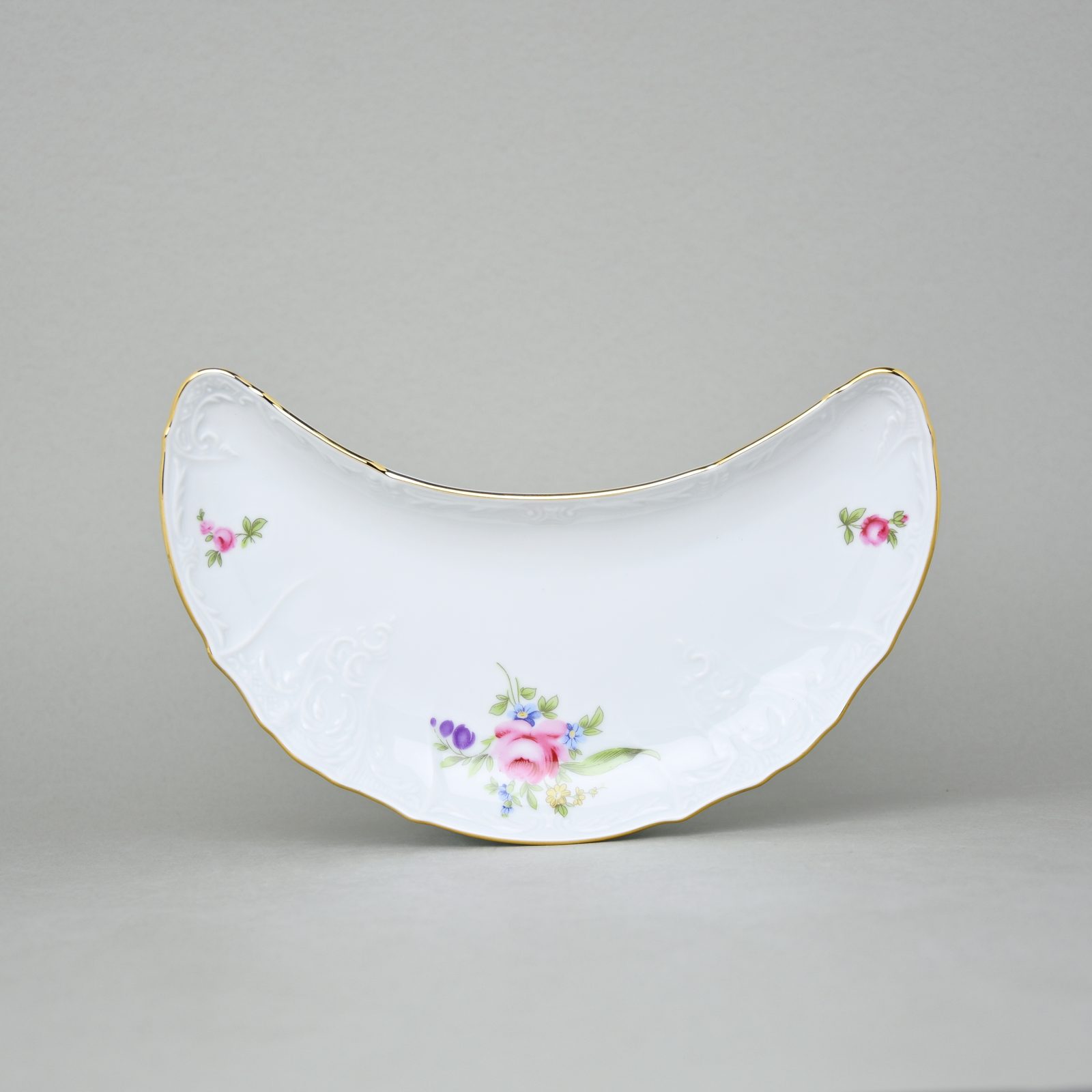 Miska na kosti 22 cm Bernadotte, dekor Míšeňská růže. Víte, proč mají misky na kosti obvykle tvar půlměsíce? Ne snad, že by s měsícem měly něco společného... díky tomuto tvaru Vám miska pasuje krásně okolo horního okraje jídelního talíře, kam ji přiložíte a žádné kosti se při přenášení už nebudou trousit na ubrus! ;-).