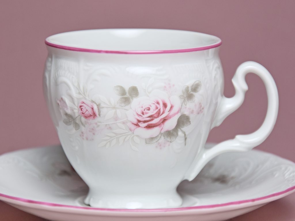 Krásný porcelánový šálek s podšálkem Bernadotte v něžném dekoru růžičky s růžovou linkou (5396055), vyrobeno v tradiční české porcelánce Thun v Karlových Varech. Vhodné pro slavnostní události, ale i denní použití. Krásný dárek.