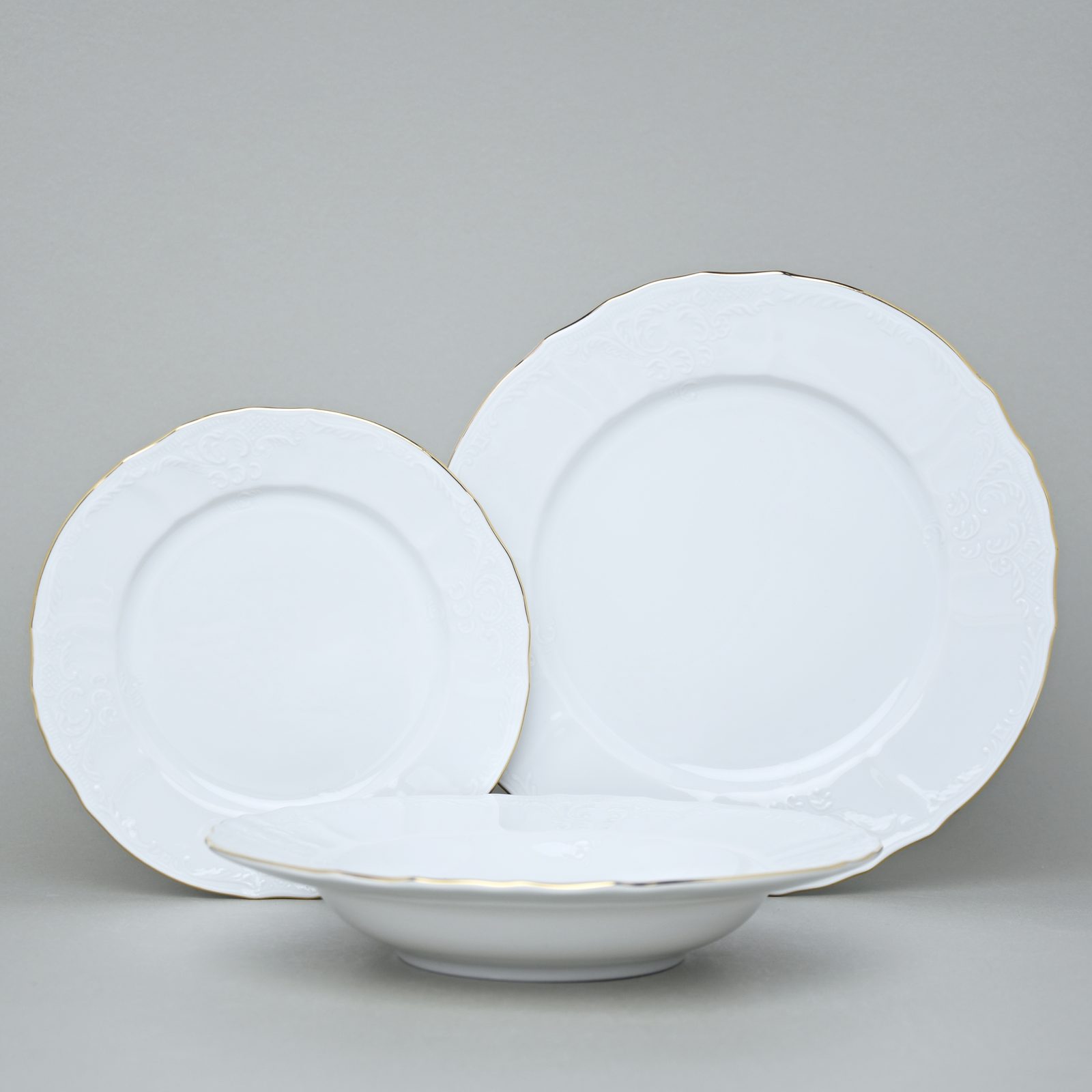 6x talíř mělký 25 cm, 6x talíř hluboký 23 cm, 6x talíř dezertní 19 cm. NAPROSTÁ KLASIKA.
