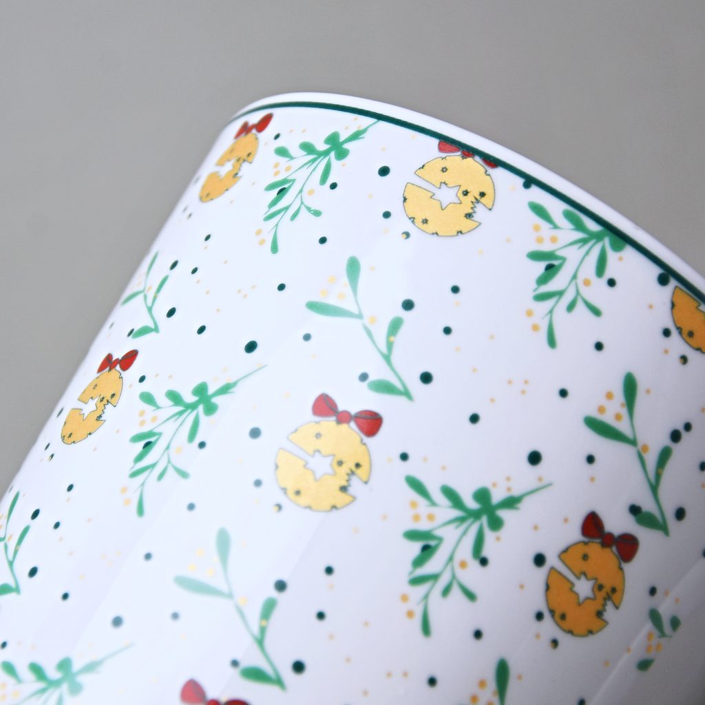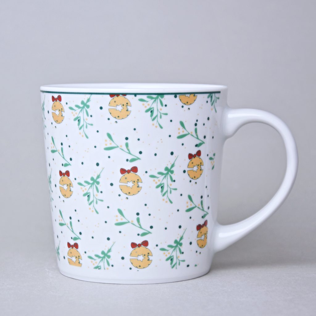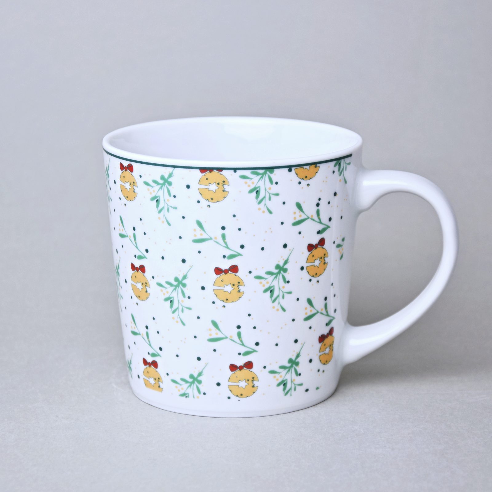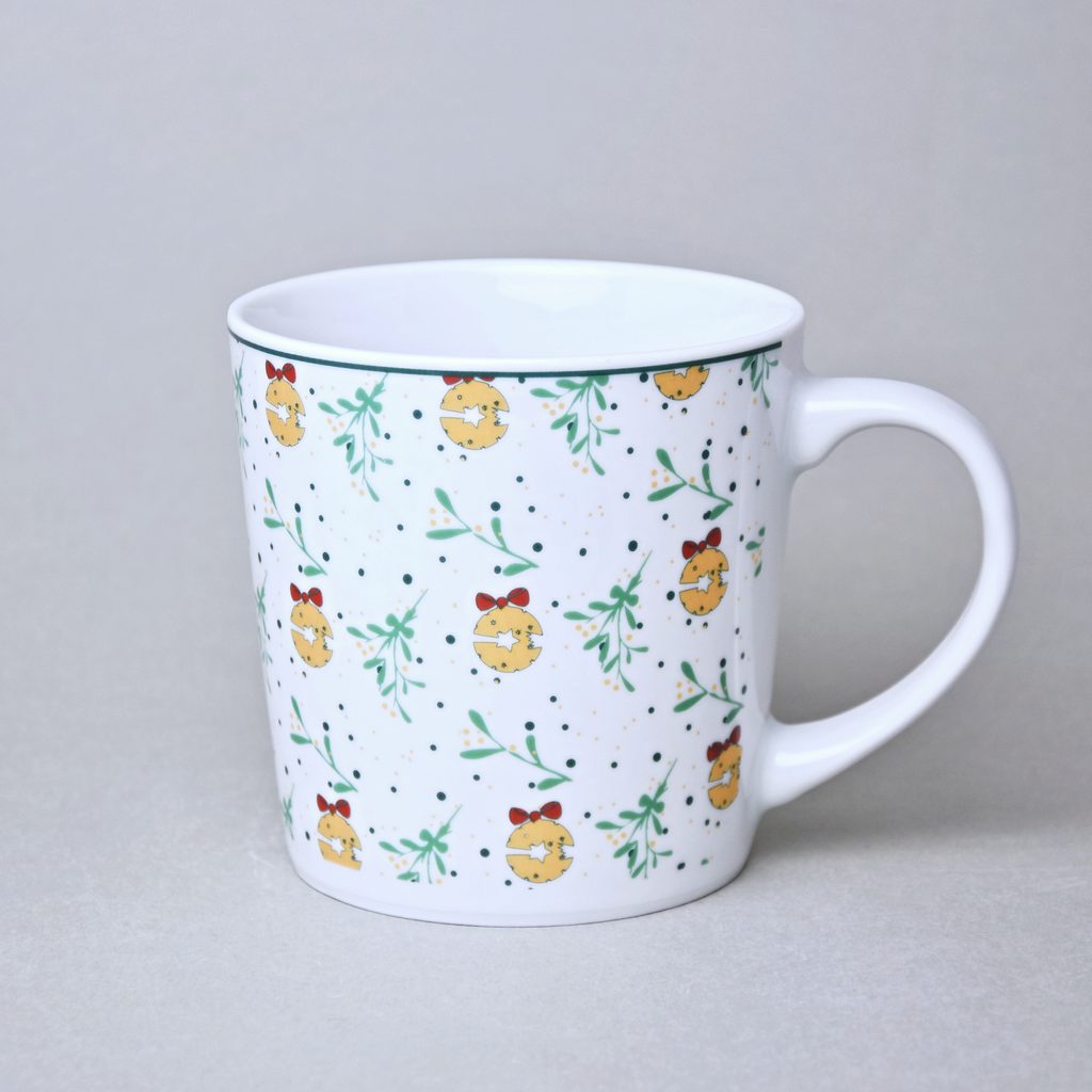 Objemný hrnek Tomáš na velký čaj / kakao. Vánoční dekor se zlatými ozdobami a zelenými větvičkami. Vyrobeno v české porcelánce Thun 1794.