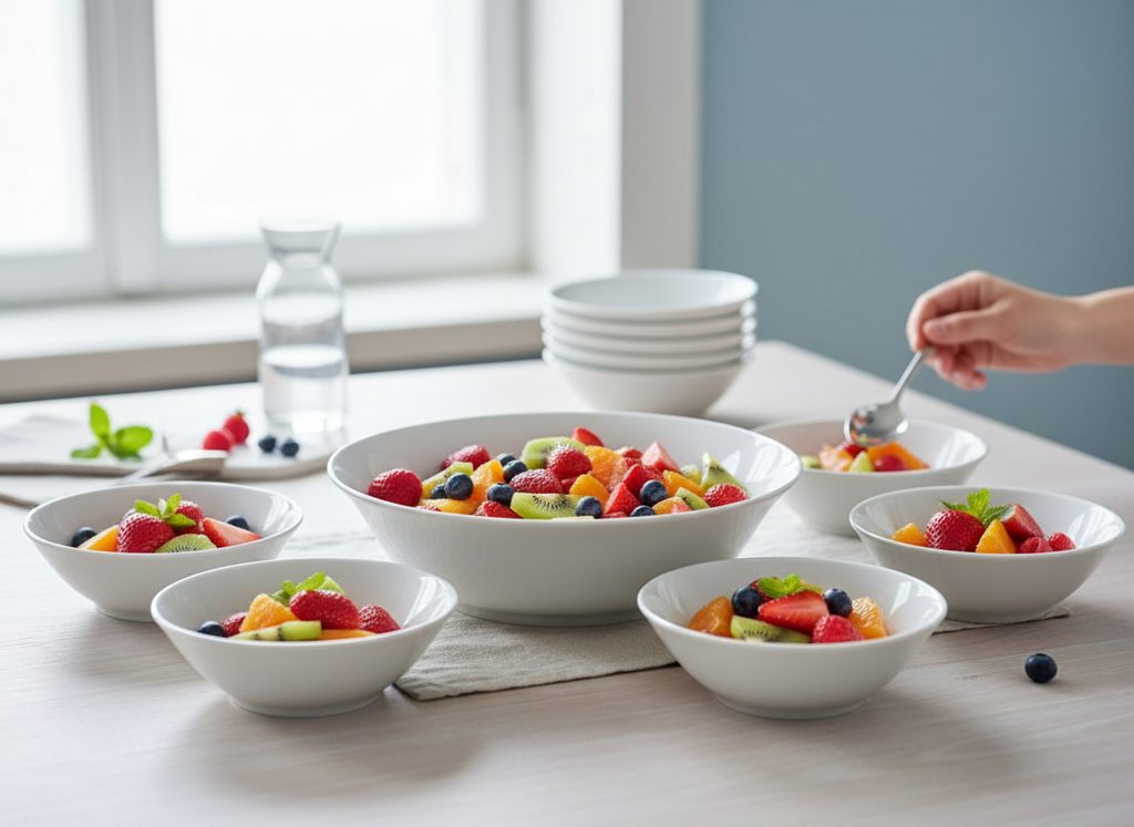 6x miska 13 cm plus mísa hluboká 23 cm Jeden z nejprodávanějších prostých moderních tvarů karlovarského porcelánu, tvar Jana (shodný tvar s tvarem Opál). Kvalitní bílý nedekorovaný porcelán pro každodenní použití. MYČKA A MIKROVLNKA OK.