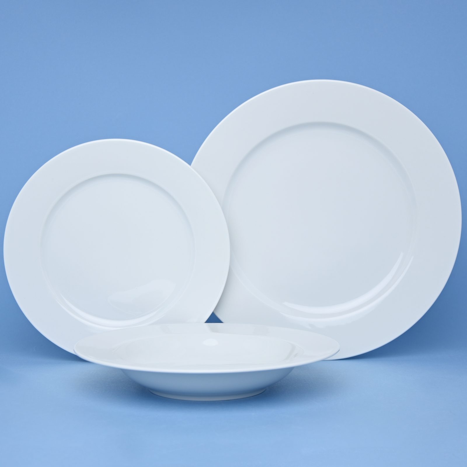 BÍLÁ TALÍŘOVÁ SOUPRAVA S VELKÝMI TALÍŘI. Na velkém mělkém 27 cm talíři skvěle vynikne Váše hlavní jídlo. Na 21 cm dezertním talíři bude parádně kontrastovat Váš povedený dezert či vydatná snídaně. Kvalitní jednoduchý karlovarský porcelán tvar Nina (Jana, Opál). 6x mělký talíř 27 cm, 6x dezertní talíř 21 cm, 6x hluboký talíř 22 cm. Jeden z nejprodávanějších prostých moderních tvarů karlovarské..