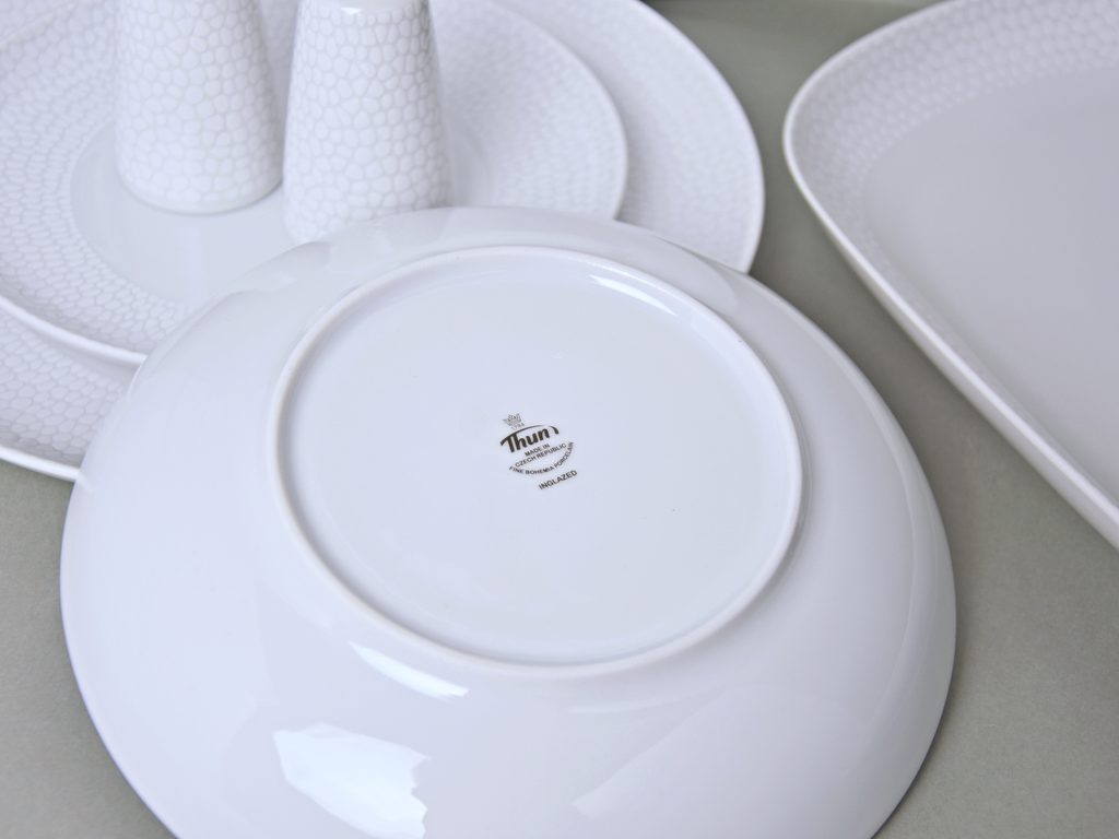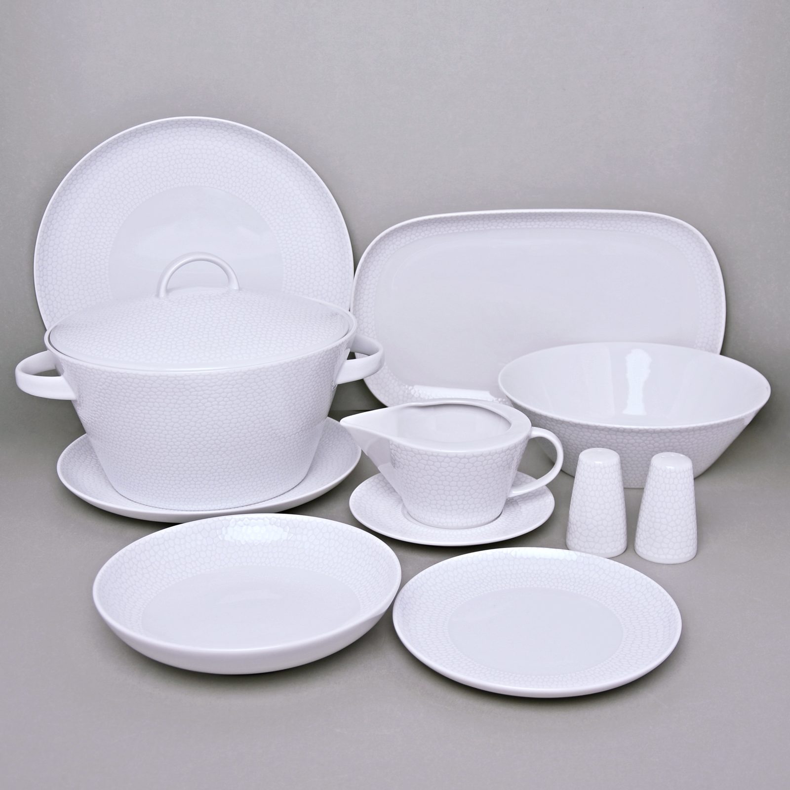 6x talíř mělký 26 cm, 6x talíř hluboký 20,5 cm, 6x talíř dezertní 19 cm, mísa polévková 3 l, mísa oválná 36 cm, mísa mělká 30 cm, mísa hluboká 24 cm, omáčník s podomáčníkem 0,4 l, slánka a pepřenka