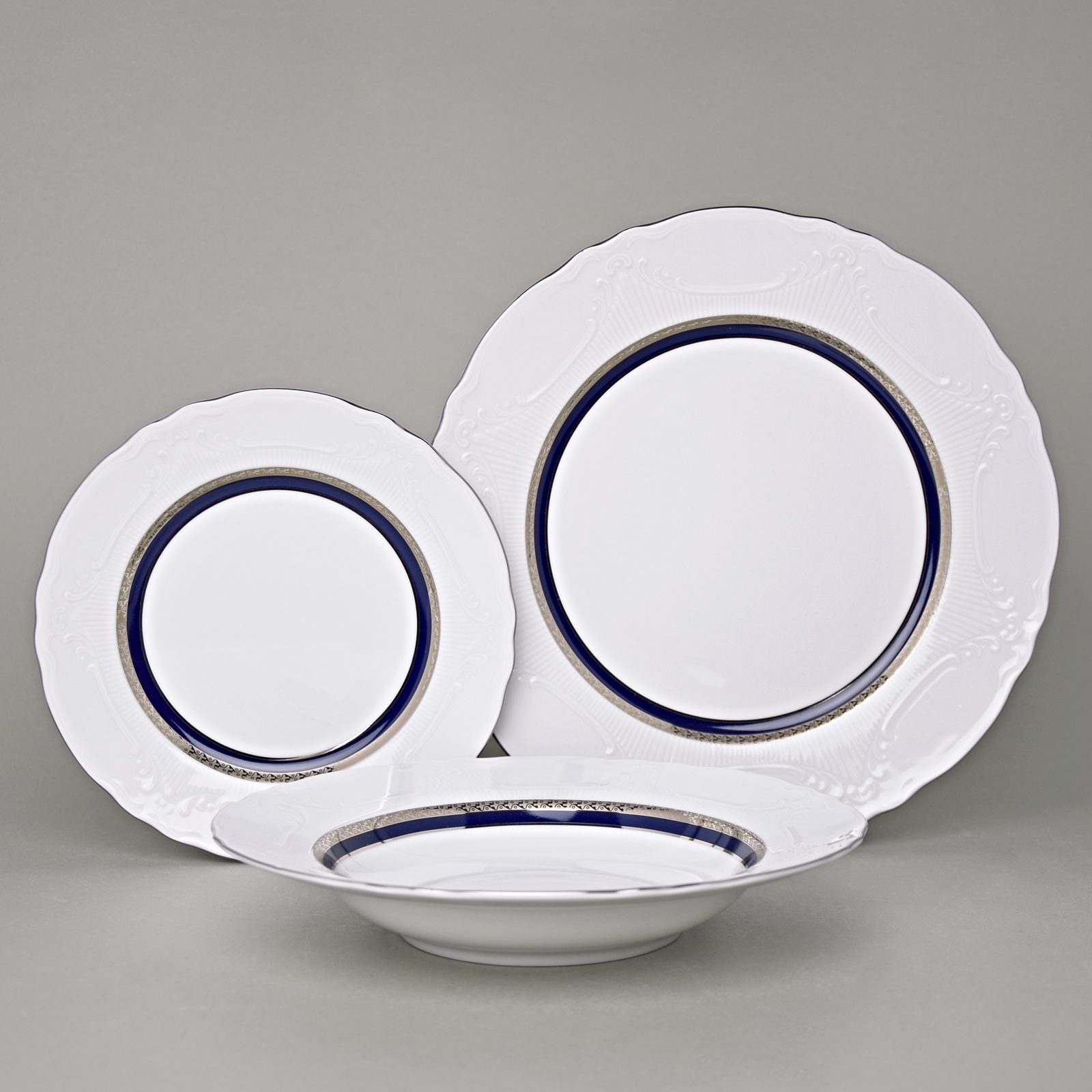 Reliefní lehký tvar Vicomte z THUNu karlovarský porcelán, dekorovaný nepravým platinovým leptem a kobaltovou modří. Nádherný porcelán pro slavnostní okamžiky. 6x mělký talíř s moderní velikostí 27 cm, 6x talíř hluboký 23 cm, 6x talíř dezertní 19 cm