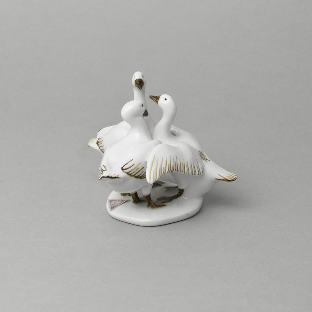 Porcelánová figurka tří hus, čistě bílé, zdobeno hnědými detaily. Velice nadčasový moderní design. Vyrobeno v tradiční české manufaktuře Duchcov (Royal Dux Bohemia).