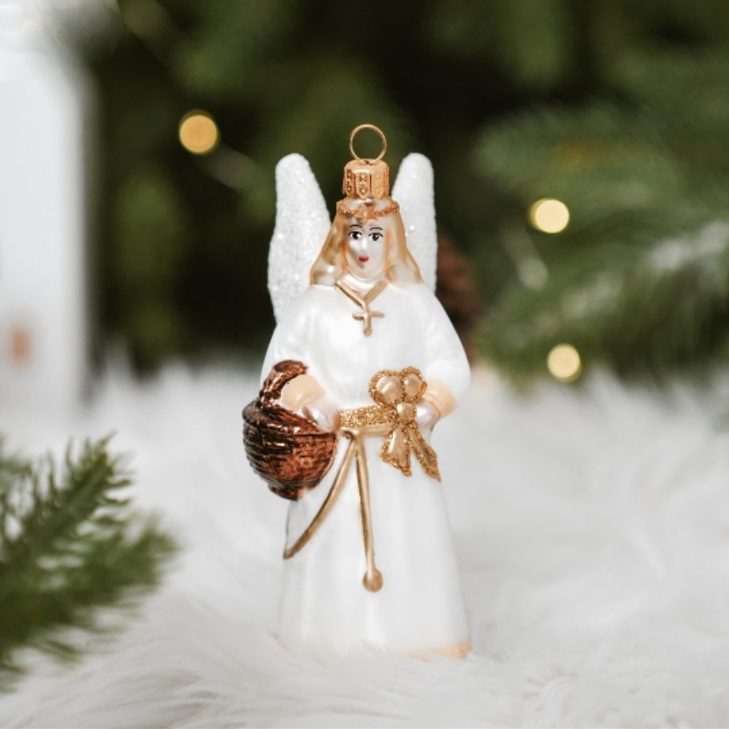 Stejně jako v knihách a ilustracích, i náš anděl má roucho v bílé barvě se zlatými detaily, v ruce hnědý koš na dárky a  především stříbrná andělská křídla.