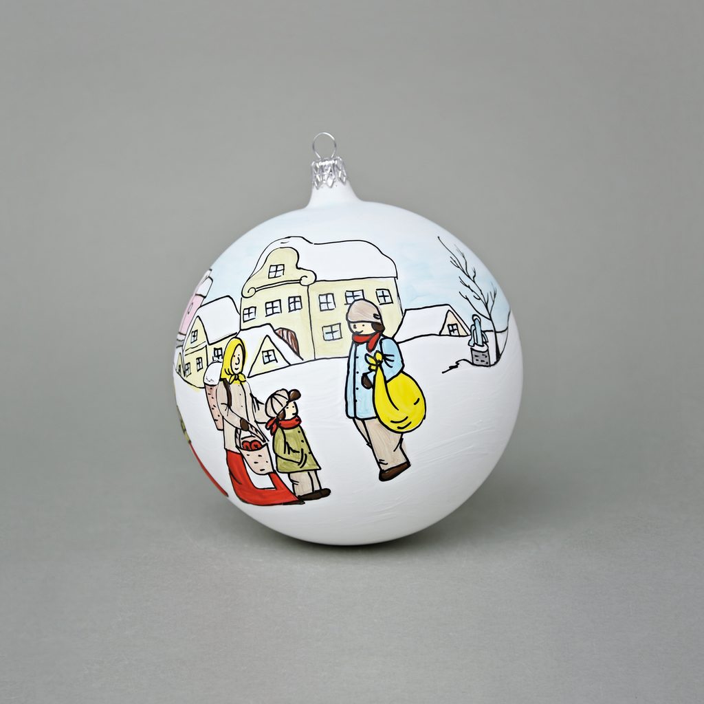 Ručně foukaná a malovaná vánoční ozdoba na stromeček - velká (12 cm). Dekor "Česká zima 1918". České sklo.