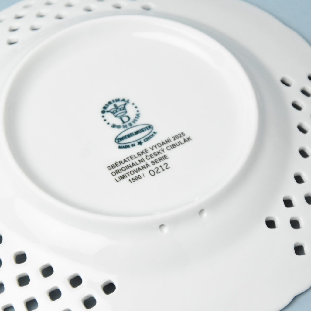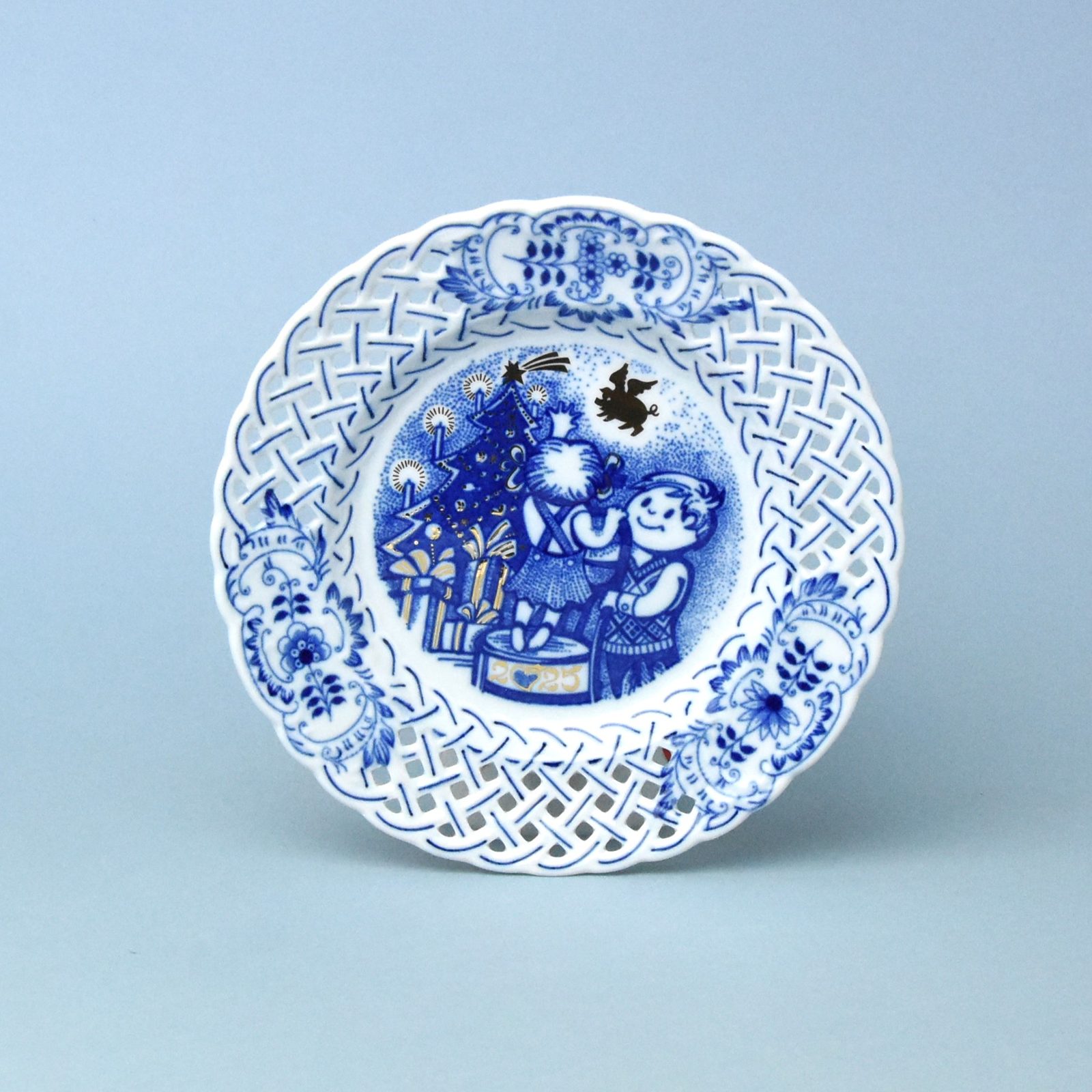 Vanoční talíř 2025 cibulákový, prolamovaný (tradičně každý pátý rok), zdobený zlatým dokreslením. Prvních 1500 ks. s číslováním. Od 1501. kusu už bez číslování. Prolamovaní (díry) v porcelánu není snadná technika, velmi náročná na zručnost a vypálení.