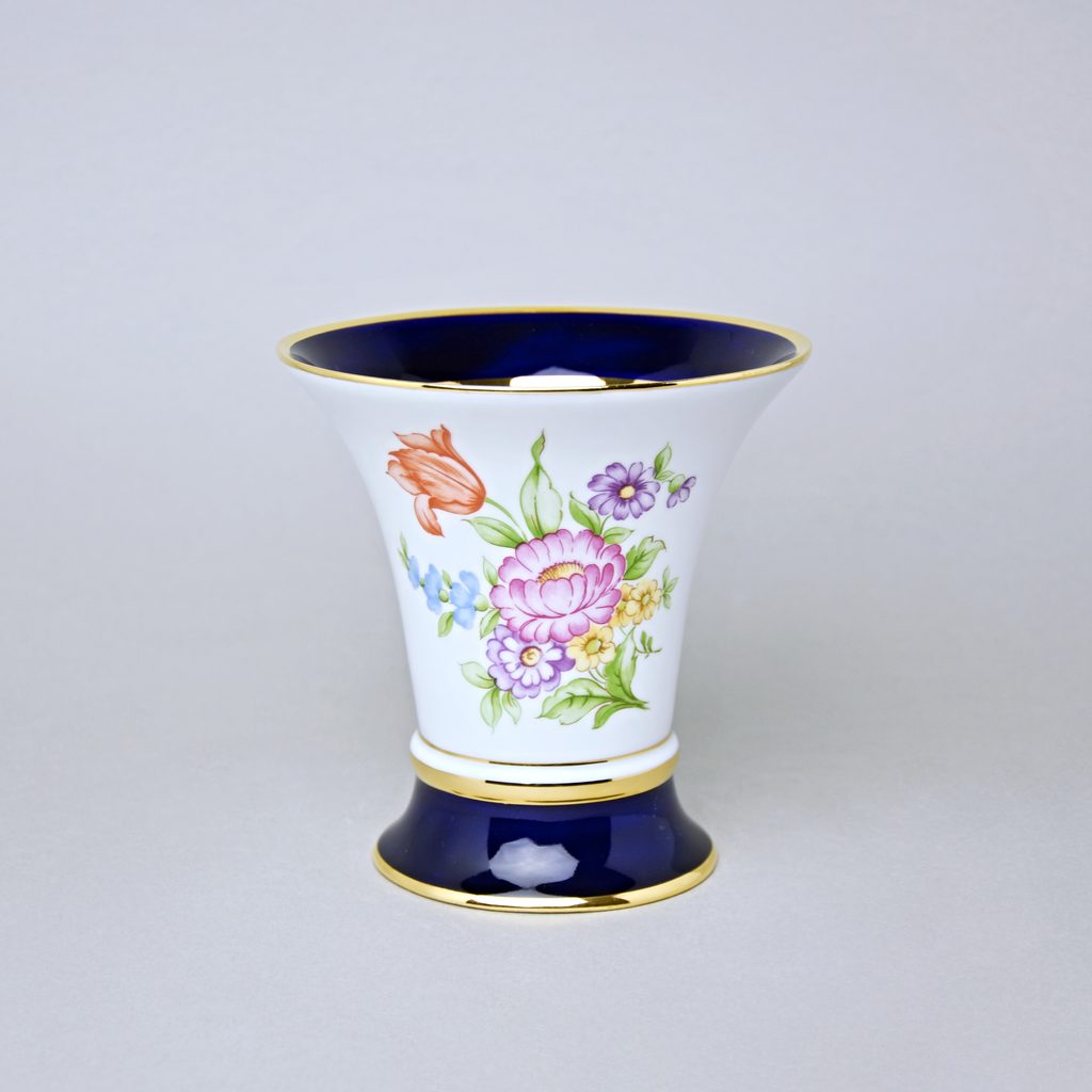 Porcelánová váza s květinami z tradiční manufakturní dílny Duchcov (Royal Dux Bohemia). Elegantní ozdobný tvar je dekorován květinami a kobaltovou modří se zlatem.