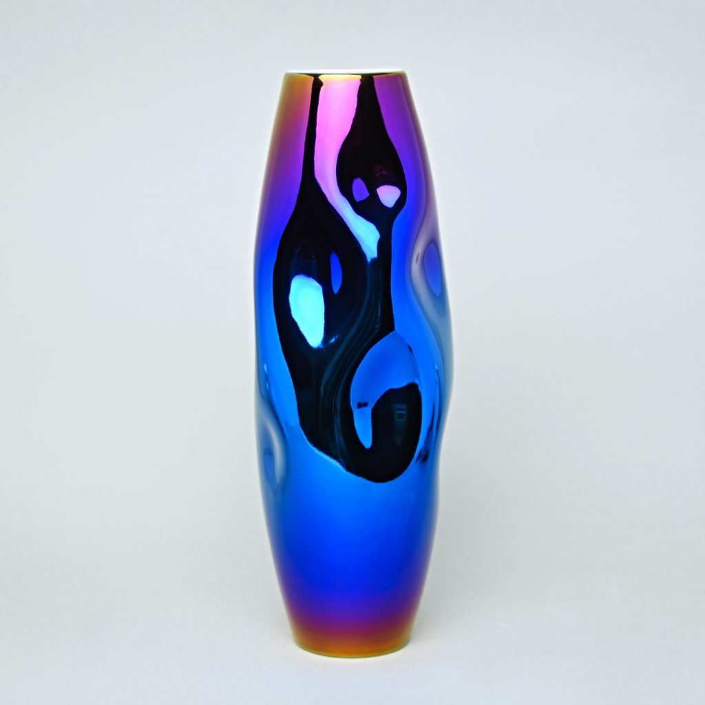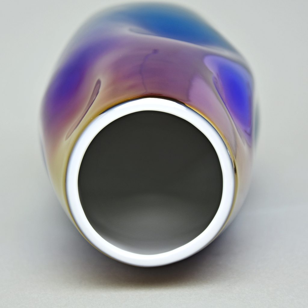 Unikátní ručně vyrobená váza s titanovou barevnou povrchovou úpravou - dominantní barva modrá, dále figurují žlutá, růžová a fialová. Barva objednaného výrobku se může lehce lišit od produktové fotografie. Co kus to originál.