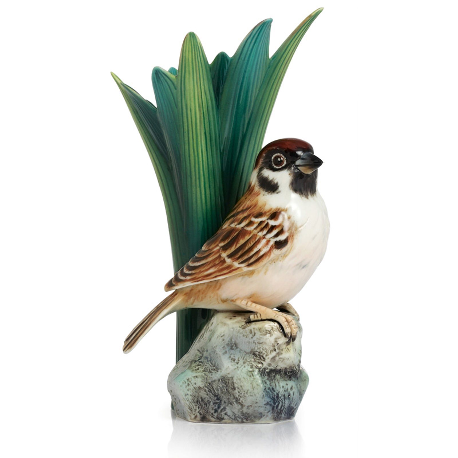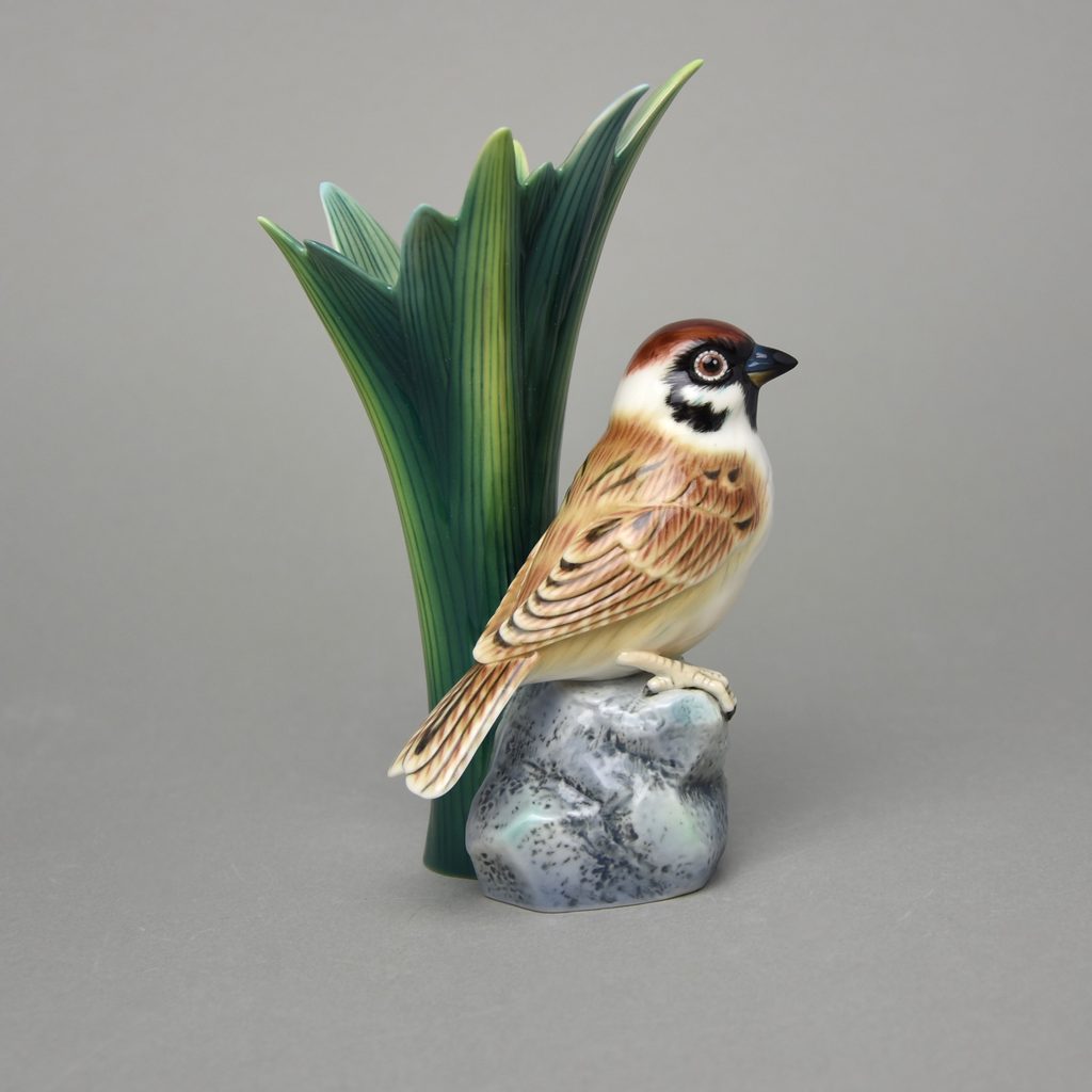 17,8 cm x 8,9 cm x 10,8 cm, roztomilá menší vázička s nádherně ručně dekorovaným vrabčákem na kameni