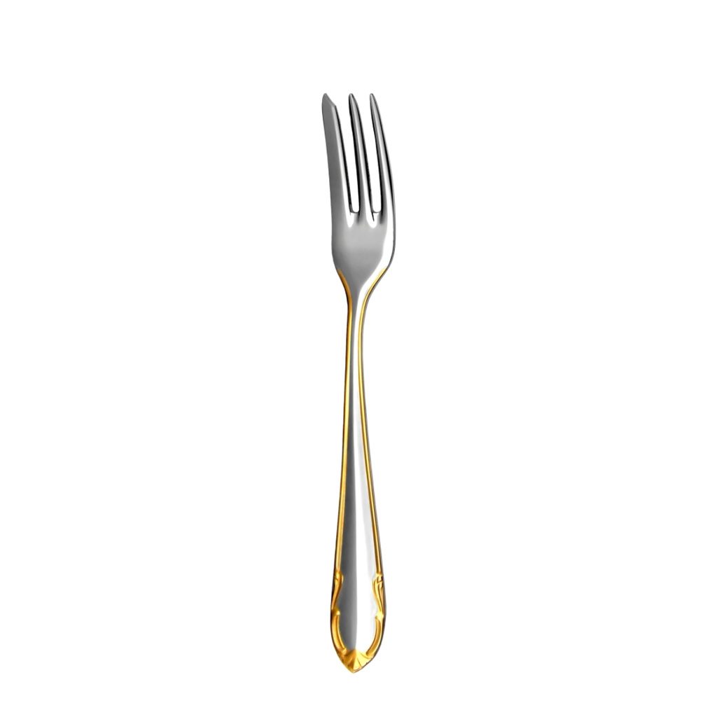 Vidlička na moučník z kvalitní nerezové oceli - nerez 18/10 od tradiční české značky příborů Toner s.r.o. už od roku 1883. Design CLASSIC PRESTIGE. Mechanicky leštěno do vysokého lesku, pozlaceno. Nehodné do myčky.